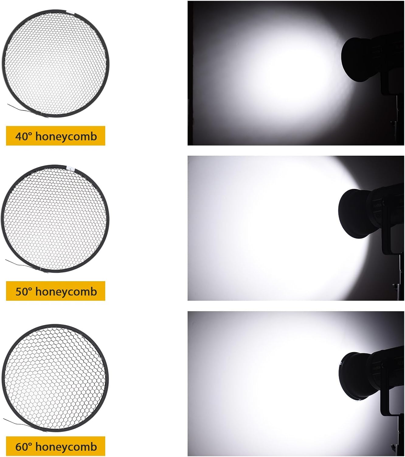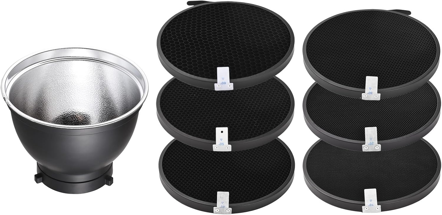 Features: 7 Inch Reflector & Honeycomb Grid Kit: This 7 inch standard reflector & honeycomb grid kit is suitable for Bowens mount photography light. Enhanced Light Output: The unique reflective texture inside the bowens mount reflector creates softer and more focused light output, perfect for achieving professional lighting effects. Create Various Lighting Effects: Comes with 6pcs(10°/20°/30°/40°/50°/60°) honeycomb grids to provide various shadow effects for you. Premium Material & Easy Installation: Made of high-quality aluminum alloy material, sturdy and not easy to deform, long service life. Easy to install and remove, no need extra tools. Wide Applications: The 7 inch reflector & honeycomb grid kit is perfect for photography of product, advertising, portrait, wedding, etc. Specifications: Material: Aluminum Alloy Honeycomb Grid Size: 16.9 * 1.2cm Reflector Size: 18 * 13.5cm Reflector Weight: 170g Package List: 1 * 7 Inch Reflector 1 * 10° Honeycomb Grid 1 * 20° Honeycomb Grid 1 * 30° Honeycomb Grid 1 * 40° Honeycomb Grid 1 * 50° Honeycomb Grid 1 * 60° Honeycomb Grid