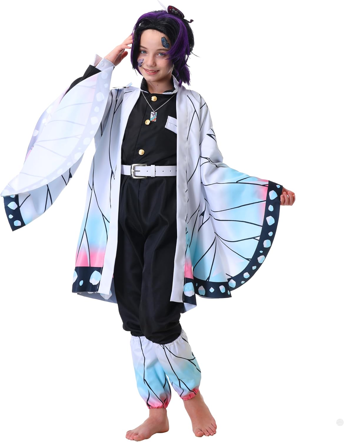 "【PACKAGE INCLUDES】--- 1* Wig, 1 * White Cloak; 1 * Black Top; 1 * Samurai Pants; 1 * Leg Wrapings; 1 * Butterfly Headwear;1 * Belt; 1 * Earrings, 1* Necklace, 1*Sticker;6* Butterfly decoration.(Full Set as the pictures show). 【APPLICABLE SCENARIOS】--- Our role play costume for Girls and Women Are perfect for comic conventions, festival cosplay, role playing, theme party, dress up, birthday party, photography, performance, etc. 【Materials】--- Our Halloween role play costume is made of high quality uniform fabric, comfortable and durable.It won't fade and ball, easy to clean. Can be washed in cold water both by machine or hand.The same printing as Anime characters. 【ABOUT OUR SIZE】--- We have full size for your choice. Please choose the size according to the chest, shoulders and waist in chart. You can refer to the size chart to choose clothes suitable for your child and you. Please understand that 120, 130, 140, 150, 160 is kid's size; that S, M, L, XL, XXL is adult's size. 【ANIME DESIGN】--- The design of our Costume Kimono is inspired by famous anime characters.If you have family or friends who are fans, I recommend it as a gift."