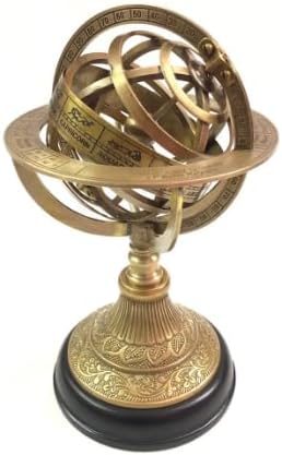 This is an antique brass globe engraved armillary sphere globe on a black wooden base. Globe is an armillary globe mounted on a black wooden base. The globe is made of brass and has an antique finish. The globe is engraved with traditional geographic coordinates and is a perfect decor piece for your home or office. This globe is an excellent gift for any occasion and is sure to impress your friends and family.