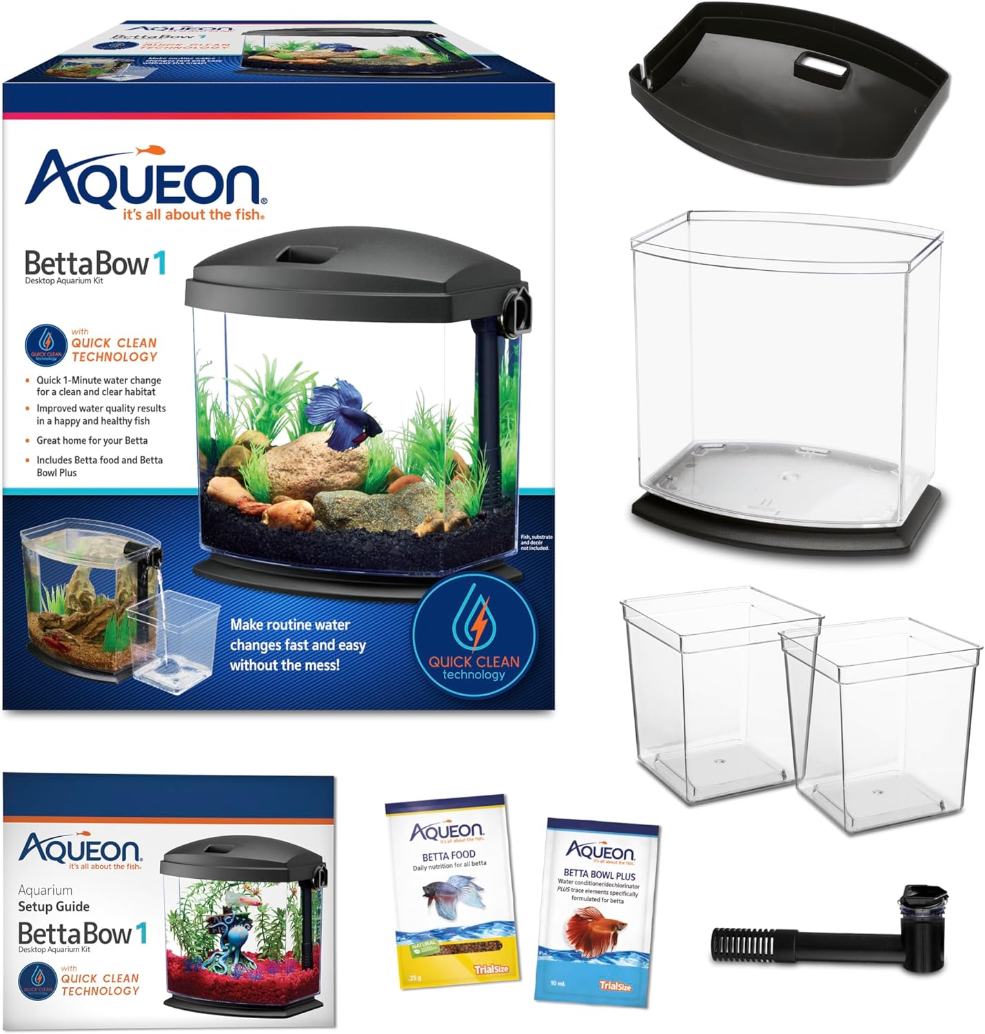 Aqueon products are expertly designed to maintain a thriving environment for your aquatic pets. Aqueon BettaBow with Quick Clean Technology Aquarium Kit is great for first-time and experienced fish keepers. This aquarium makes the perfect addition to bedrooms, living rooms, home offices and more. This kit includes a clear acrylic vessel, low profile hood, elevated base, two collection cups, water care and food samples to get you started. It also features Quick Clean Technology – a one-of-a-kind side spout that helps empty the aquarium quickly and with no mess. A setup guide is also included to walk you through the process of proper aquarium setup. Aqueon empowers hobbyists and beginners alike to explore the wonders of aquatic life.
