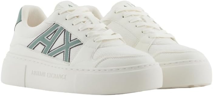 This Armani Exchange Women's Thick Platform Sneaker has a Bold AX Logo brightly outlined on the side of the shoe.