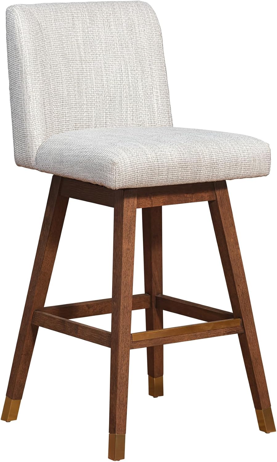 The classic style of the Amalie Bar or Counter Stool in Wood with Fabric Upholstery is available in multiple color choices. This kitchen barstool makes a beautiful addition to any home or apartment. Counter or bar height stools are an easy upgrade to make if you’re remodeling or an easy fix if you’re moving and haven’t purchased your dining room furniture yet. The Amalie counter or bar height stools feature a sturdy wood 4 leg base constructed from rubberwood. Rubberwood is a durable hardwood belonging to the maple family. Its dense grain character makes it a stable construction material that is naturally resistant to fungus and bacteria. The polyester upholstery really helps these wood bar stools stand out. The long-term durability of polyester makes it an ideal choice of stool upholstery fabric for families with children and pets. Polyester upholstery is water repellent, stain resistant, budget friendly, and less prone to discoloration. The soft upholstery of this swivel bar stool creates a convenient combination of comfort and function. The Amalie stool features gray or taupe options in boucle fabric. The fuzzy nature or bouclé means its pairs perfectly with curved or rounded pieces like asymmetrical sofas, armchairs, and of course the Amalie bar stool. The 360-degree swivel seat allows you to swivel either way with full mobility. The Amalie stool is available in your choice of a 26 inch or 30 inch seat height and comes in a gray oak wood finish with boucle gray or mocha upholstery or a brown oak wood finish with boucle taupe or beige fabric upholstery.