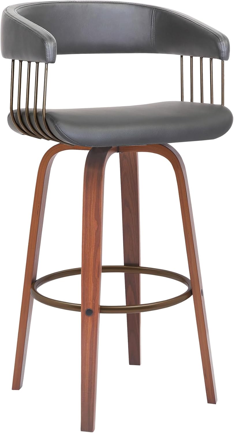 Bring refined style and sophistication to your bar or high dining table with our Topanga upholstered bar or counter stool. A beautifully curved back and seat are held together with a crisp and clean-lined frame to make a statement in any corner. Its hugging barrel back and contoured seat is generously padded to offer sink-in comfort. Complemented with sculptural bentwood legs and a metal footrest, our bar stool blends eye-catching style with a dose of comfort and functionality. It is upholstered in faux leather which does not crack or fade easily; the material is both stain and UV resistant for easy maintenance and longevity. Expertly crafted from engineered wood and metal, our contemporary bar stool remains a rich blend of materials and finishes, bringing luxury and sophistication anywhere from your kitchen to a home office. It remains the perfect complement to a kitchen island, pub table, home bar, or adjustable desk. For supreme functionality, the counter stool is fitted with a wonderful 360 degree swivel function, allowing you to join conversations and work with efficiency and ease. The Topanga swivel bar or counter stool easily incorporates into any home and is available in your choice of 26-inch or 30.5 -inch seat height in a walnut wood and golden bronze finish with cream or gray faux leather, or a black and golden bronze finish with your choice of gray or black faux leather upholstery.FeaturesProduct Dimensions: W: 18 x D: 20 x H: 36 x Seat H: 26Swivel Function: 360-degree smooth glide swivel allows you to change directions with easeHeight Variation Options: This bar or counter stool comes in 26"; counter height or 30.5"; bar height optionsColor Options: A unique variety of color and finish options availableUniversal Application: Use this bar chair in your kitchen, home bar, or dining spaceSimple Assembly: Clear step-by-step instructions ensure quick and easy setupQuality Assurance: Armen Living proudly provides 1-year limited manufacturer warranty for your peace of mindDimensions:Counter StoolAssembled Product: 18 inches wide x 20 inches deep x 36 inches highSeat Width: 17 inchesSeat Depth: 16 inchesSeat Height: 26 inchesCushion Thickness: 2 inchesBack Height: 9.75 inchesArm Height: 34 inchesWeight Capacity: 250 poundsArmen Living leads in modern furniture design and manufacturing, providing end-to-end solutions globally. We exceed client expectations with speed and flexibility, delivering exceptional products with reliability and innovation. Based in Southern California, our distribution center serves retailers, designers, and hospitality providers worldwide. Offering a wide range of designs, including originals, we're a trusted resource for stylish modern furniture, committed to quality and customer satisfaction.