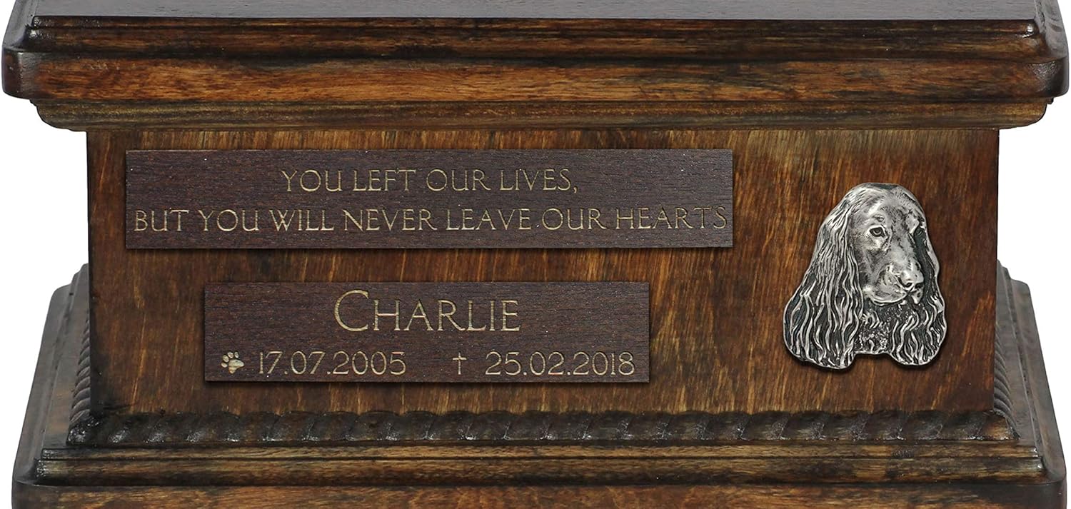 Handmade with precision and care, this cremation box combines artistry with functionality to create a unique and lasting tribute. The Cold Cast Bronze Dog statue, intricately detailed, becomes a focal point of this urn, capturing the spirit and essence of your furry companion. Crafted from durable birch wood, the urn makes for a secure and enduring final resting place. The wooden material adds a touch of warmth and natural beauty, making it a fitting tribute to your pet's memory. Customization is at the core of our Art-Dog Collection, offering a diverse range of statues representing any breed. This allows you to create a personalized memorial that truly reflects the unique qualities of your beloved pet. The wreath-shaped decorations further enhance the urn's aesthetic appeal, adding a subtle yet elegant charm to the overall design. Practicality meets style with the convenient removable lid, ensuring an easy and respectful process for placing your pet's ashes. The urn's dimensions, measuring 21 x 29 x 11 cm, strike a balance between ample space for ashes and a compact size that fits seamlessly into your home. More than just a container, this exclusive Dog Urn by Art-Dog is a meaningful work of art, radiating style and elegance. It stands as a testament to the enduring love and companionship you shared with your pet, creating a memorial that will forever honor their memory.