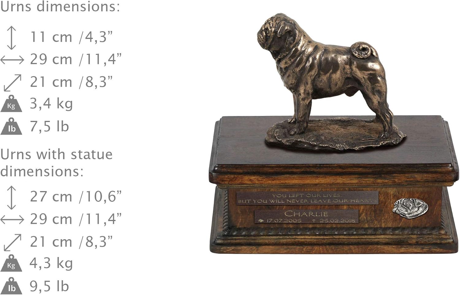 Handmade with precision and care, this cremation box combines artistry with functionality to create a unique and lasting tribute. The Cold Cast Bronze Dog statue, intricately detailed, becomes a focal point of this urn, capturing the spirit and essence of your furry companion. Crafted from durable birch wood, the urn makes for a secure and enduring final resting place. The wooden material adds a touch of warmth and natural beauty, making it a fitting tribute to your pet's memory. Customization is at the core of our Art-Dog Collection, offering a diverse range of statues representing any breed. This allows you to create a personalized memorial that truly reflects the unique qualities of your beloved pet. The wreath-shaped decorations further enhance the urn's aesthetic appeal, adding a subtle yet elegant charm to the overall design. Practicality meets style with the convenient removable lid, ensuring an easy and respectful process for placing your pet's ashes. The urn's dimensions, measuring 21 x 29 x 11 cm, strike a balance between ample space for ashes and a compact size that fits seamlessly into your home. More than just a container, this exclusive Dog Urn by Art-Dog is a meaningful work of art, radiating style and elegance. It stands as a testament to the enduring love and companionship you shared with your pet, creating a memorial that will forever honor their memory.