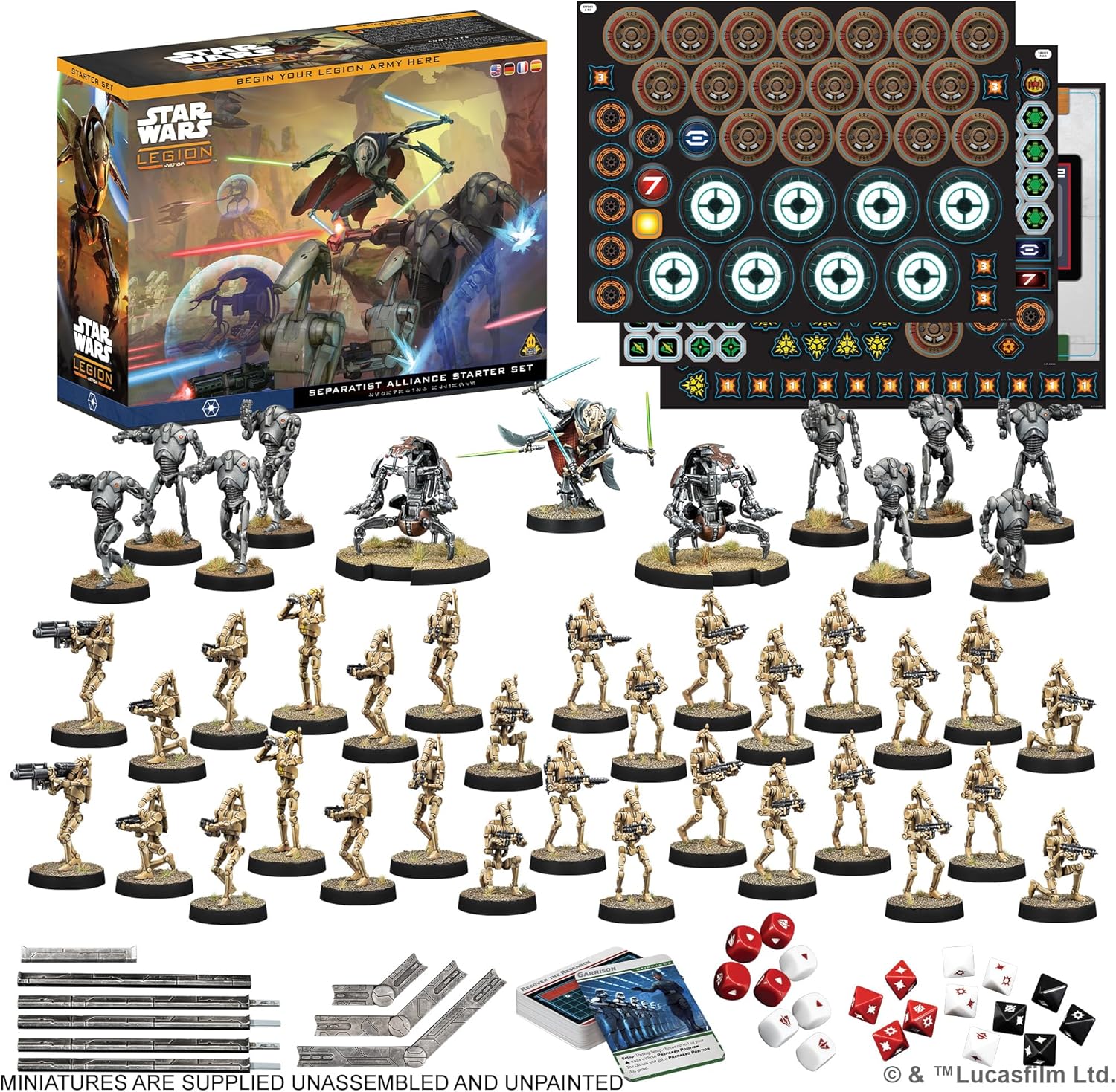 Command the power of the Separatist Alliance in the Star Wars: Legion – Separatist Alliance Starter Set, where you lead an army of battle droids, Separatist commanders, and support vehicles to overwhelm the Galactic Republic. With their sheer numerical superiority, the Separatist droid forces offer a versatile and tactical approach to any battle. The Separatist Alliance Starter Set provides: 600-point Recon-level army – Includes battle droids and Separatist commanders, including iconic figures such as Count Dooku and General Grievous. Dice, templates, tools, and tokens – Everything you need to get started and begin your Star Wars: Legion journey. Compatible with future expansions – Once you’re comfortable with the basics, expand your army with additional Star Wars: Legion unit boxes. Designed for 2 players, ages 14 and up, this set offers an exciting way to dive into the tactical world of Star Wars: Legion. Whether you’re leading the Republic forces or playing as the Separatists, this set is the ideal starting point for an epic battle between the light and dark sides of the galaxy. Ready to lead your Separatist forces to victory? Add the Separatist Alliance Starter Set to your collection today and start commanding the galaxy!