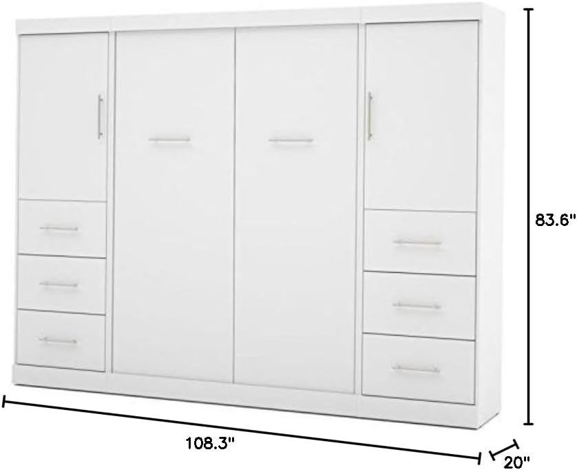 The Atlin Designs Full Murphy bed with 2 wardrobes (109W) is the ideal space-saving solution. The bed folds up and down smoothly and accommodates most standard full mattresses. Closet organizers each feature 2 fixed shelves and 3 adjustable/removable shelves as well as 2 clothing rods, 3 drawers, and 2 doors. The dual-mount wall bed mechanism attaches to the floor and wall for maximum stability and durability. To avoid risk of injury, the Murphy bed must be installed to wall and floor structure by a professional or qualified person. Two people are required for assembly. Installation requires attachment to wood studs or masonry, removal of the baseboard, and drilling into the floor. Necessary hardware is included. Do not use this product for children or pets under 50 pounds (22.7 kg). North American made with globally sourced materials.Features:- Material: Laminated engineered wood, steel metal- Finish: White- Do not use this product for children or pets under 50 pounds (22.7 kg); maximum weight supported with mattress is 1000 pounds (453.6 kg)- Wall bed accommodates most standard full mattresses (8-10" thick, 60-90 lb, 54 x 75", no futons) to let you choose the most comfortable option (mattress not included, do not use with box spring)- Dual piston system allows you to fold the murphy bed up and down smoothly and quickly; mattress support uses flexible slats that follow the curves of the body and absorb pressure for maximum comfort- Durable steel wall bed frame and laminated engineered wood cabinet with leg levellers- Closet organizers each feature 2 fixed shelves and 3 adjustable/removable shelves to accommodate items of various sizes as well as 2 clothing rods, 3 drawers, and 2 doors- Clean lines and brushed nickel handles complement the contemporary finish of your choiceSpecifications:- Product Dimensions: 83.66"H x 108.66"W x 86.83"D- Product Weight: 752.4 lbs- Product Height: (Minimum Ceiling Height of Anchoring Wall) 85.8"- Assembly details: Dual-mount wall bed mechanism attaches to floor and wall for ease of assembly and maximum stability and durability- Assembly details: Installation requires attachment to wood studs or masonry, removal of the baseboard, and drilling into the floor (if disassembly is required, holes may be covered with baseboards 0.5 inches or thicker); all necessary hardware is included- Assembly details: To avoid risk of injury, bed must be installed to wall and floor structure by a professional or qualified person; two people are required for assembly
