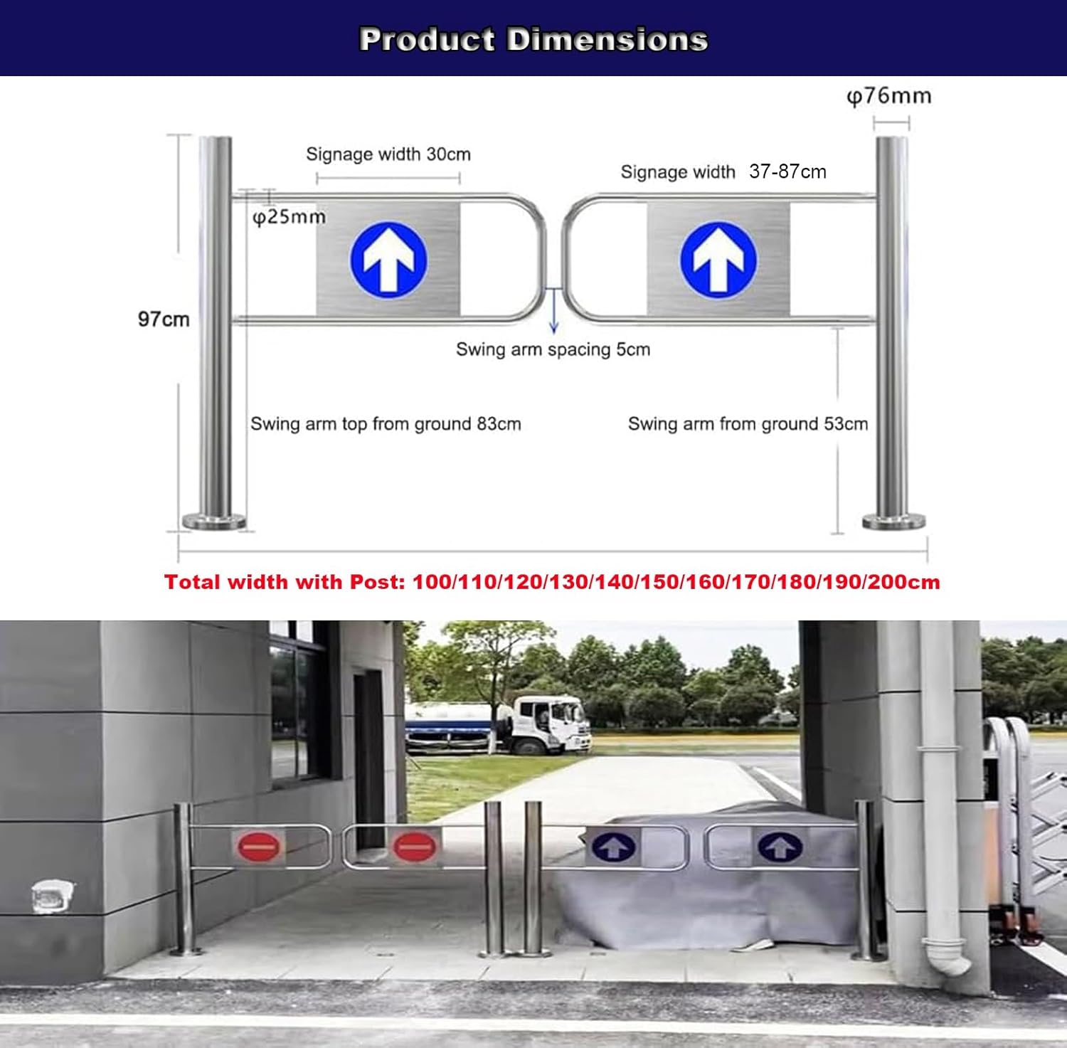 Introducing our Automatic Swing Door, the perfect solution for high-traffic areas such as markets, warehouses, libraries, and home decor stores. **Key Features and Benefits:** 1. **One-Way Entry:** Designed for controlled access, this swing door allows only one direction of entry. It automatically closes after being pushed, ensuring safety and streamlined traffic flow in crowded environments. 2. ** Construction:** Crafted from high-quality stainless steel, our door is shock-resistant, rust-proof, and smooth to the touch. It is built to withstand frequent use, making it ideal for busy settings like warehouses and construction sites. 3. **Automatic Rebound Functionality:** Featuring an integrated high-elasticity spring, the door opens effortlessly with a gentle push and closes automatically without the need for electricity. Enjoy energy efficiency and ease of use for both customers and employees. 4. **Versatile Installation:** Suitable for any doorway, our swing door can be installed within 1 to 2 hours. With floor mount options, it accommodates various setups seamlessly. **Specifications:** - **Product Name:** Automatic Swing Door - **Material:** Stainless Steel Tubes - **Color:** Silver - **Height:** 97 cm (38 inches) - **Dimensions Available:** 100 x 97 cm, 110 x 97 cm, 120 x 97 cm, up to 200 x 97 cm - **Installation Type:** Drilling required - **Opening Angle:** 90° (one-way) **Ideal Use Cases:** This door is perfect for warehouses, construction sites, traffic signage areas, garages, parking lots, and work zones where controlled access and durability are essential. **Package Includes:** - 2 x One-Way Swing Doors (Installation Accessories Included) *Note: If the swing arm is too long, it can be trimmed for optimal use. For any inquiries, feel free to contact us, and we will respond within 24 hours.* Elevate the efficiency and safety of your space with our Automatic Swing Door today!