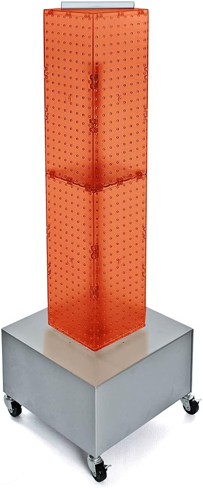 This four-sided interlocking pegboard floor display measures 8-Inch W by 8-Inch D by 40-Inch H and revolves on a wheeled metal base that measures 16-Inch W by 16-Inch D by 12-Inch H. Assembled width is 16-Inch and assembled height is 52-Inch. Sign holder strip included.
