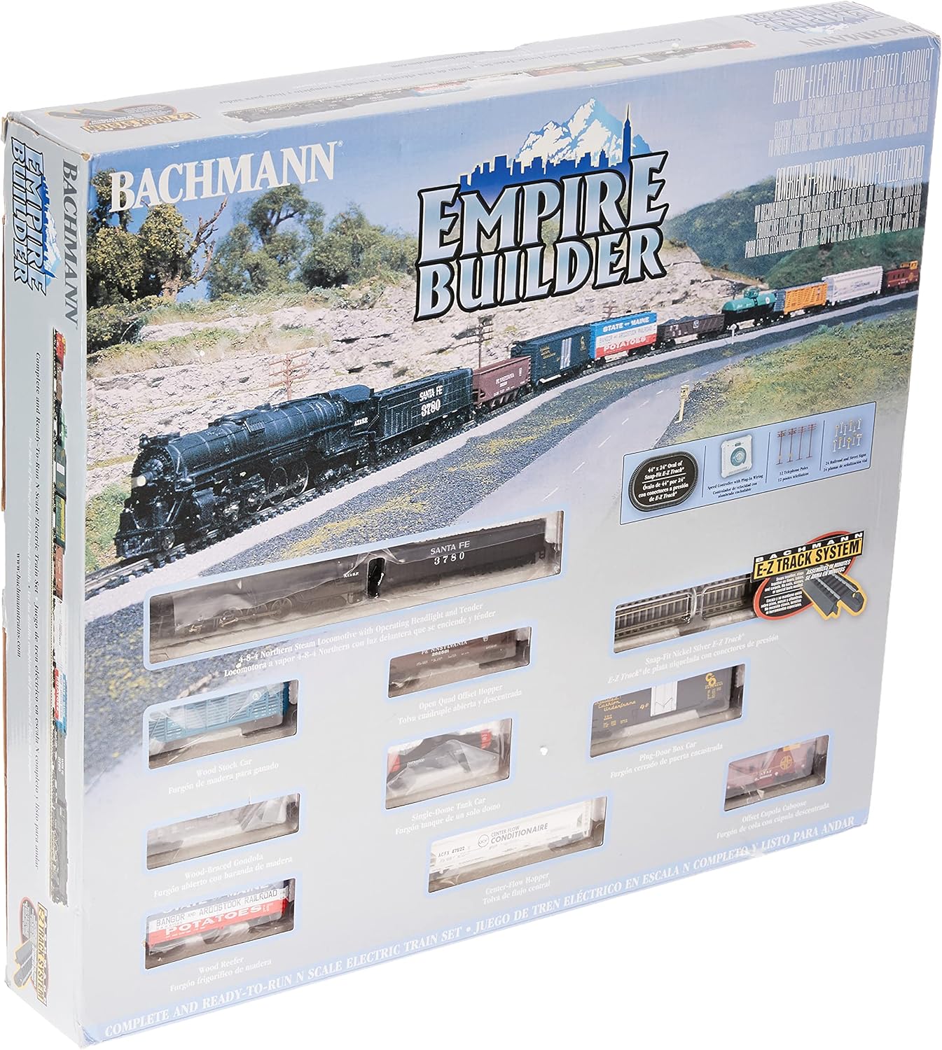 Product Description Empire Builder Ready To Run 68 Piece Electric Train Set - N Scale. American railroads helped build great fortunes and the wealth of the Nation. Doing its part, our Empire Builder train set comes complete with Bachmann‘s exclusive E-Z Track snap-fit track and roadbed system. This set includes; Northern 4-8-4 steam locomotive and tender with operating headlight, wood reefer, single-dome tank car, center-flow hopper, plug-door box car, wood stock car, wood-braced gondola, open quad offset hopper, offset cupola caboose, 44” x 24” oval of nickel silver E-Z Track including 11 pieces curved track, 8 pieces straight track and 1 curved plug-in terminal rerailer, 12 telephone poles, 24 railroad and street signs, power pack and speed controller, illustrated instruction manual. From the Manufacturer American railroads helped build great fortunes and the wealth of the Nation.