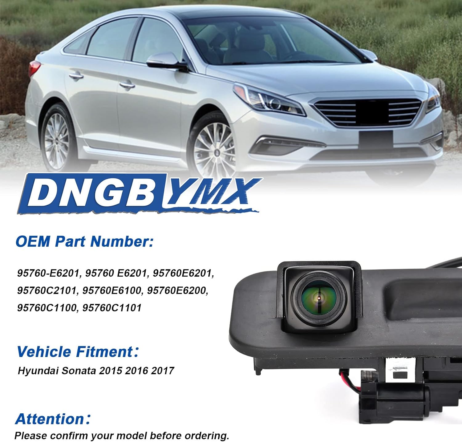 Advantage:Made of Premium Quality Material.Tested & Certified to Meet or Exceed OEM Quality Standards.Compatibility with:Hyundai Sonata 2015 2016 2017.Hyundai Sonata 15 16 17.Replaces Number:95760-E6201, 95760 E6201, 95760E6201, 95760C2101, 95760E6100, 95760E6200, 95760C1100, 95760C1101.Includes:1Pcs Sonata Rear View Backup Camera.