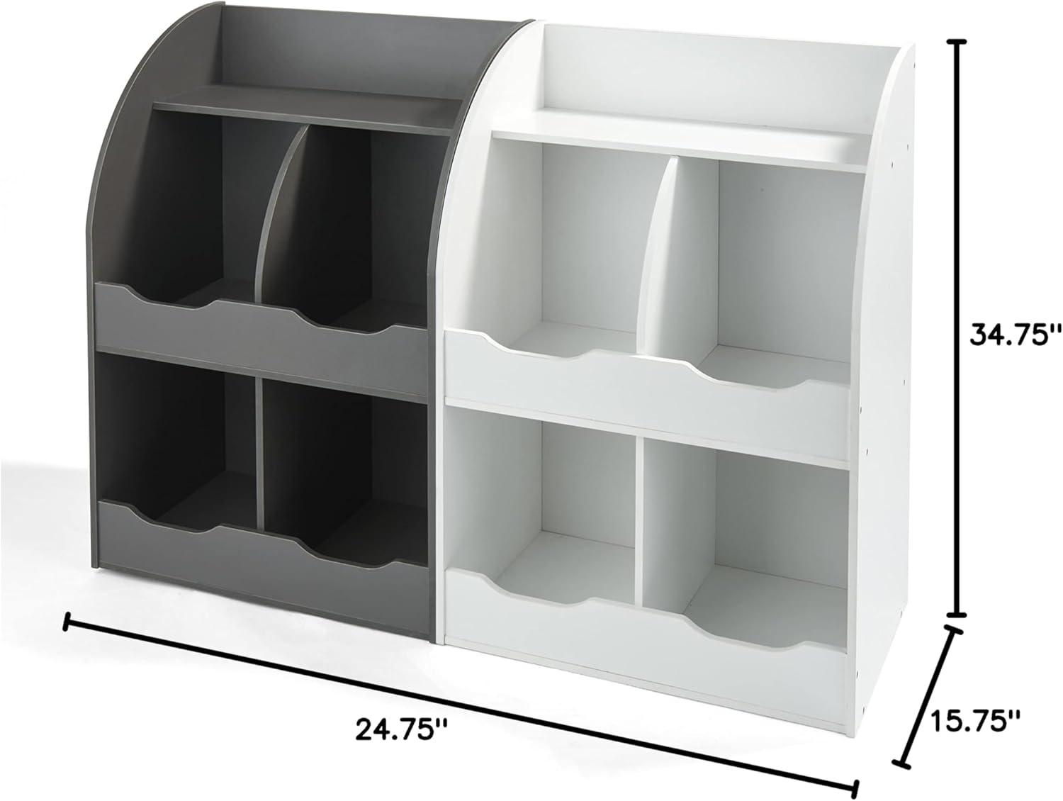 Badger Basket's Four Bin Storage Cubby's functional and stylish design allows you to organize and display your child's favorite toys. The open cubby design is great for organizing puzzles, books, dolls, and art & craft supplies, all while keeping everything within your child’s reach. In addition to the bins, the storage unit also includes a half shelf, perfect for small books and other gadgets you want to display. A single unit fits perfectly in your child's bedroom, or pair two or three units side-by-side to maximize storage for large play rooms or basements. Overall measurements 24.5L x 15.75W x 34.75H (inches). Each bin measures 11.5L x 14.5W x 13.75H (inches). Bottom bin openings measure 9.75 inches H. Top bin openings measure 11.5 inches H. Shelf measures 23.5L x 8.5W x 5.5H (inches). The bottom ledge is 4.25 inches from the floor. Solid construction, so items don’t fall out the back. Made of MDF with melamine surface. Wipe clean as needed and dry thoroughly. All measurements approximate. Adult assembly required. Illustrated assembly instructions included. Product complies with all currently applicable safety standards and CARB ATCM standards. Product includes a limited warranty of 30 Days Parts to the original purchaser. Product may vary slightly from shown and described. Props/accessories shown are for illustration purposes only and are not included with the product. Actual color/finish may vary slightly from screen display. This item ships in its original carton which may include a product photo.