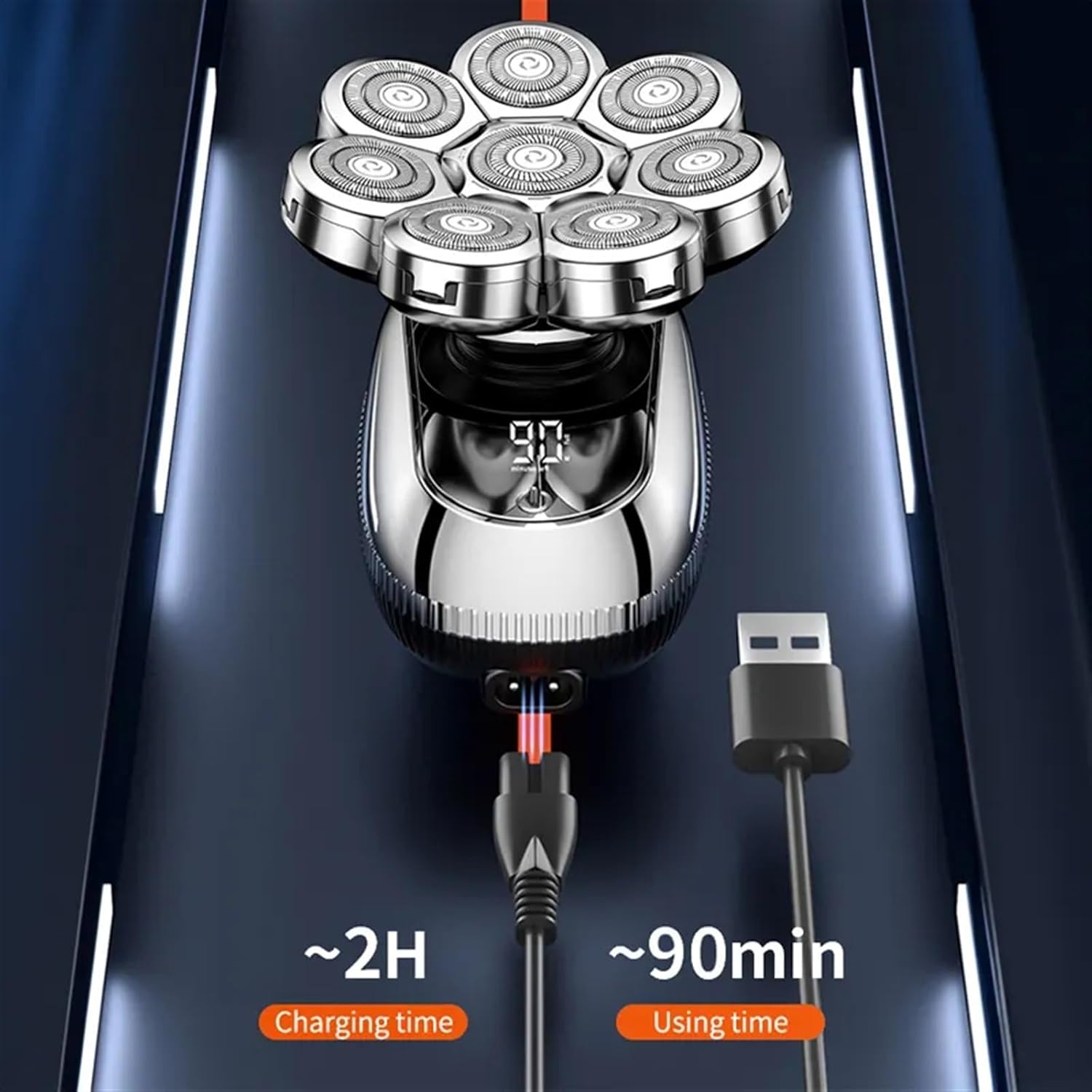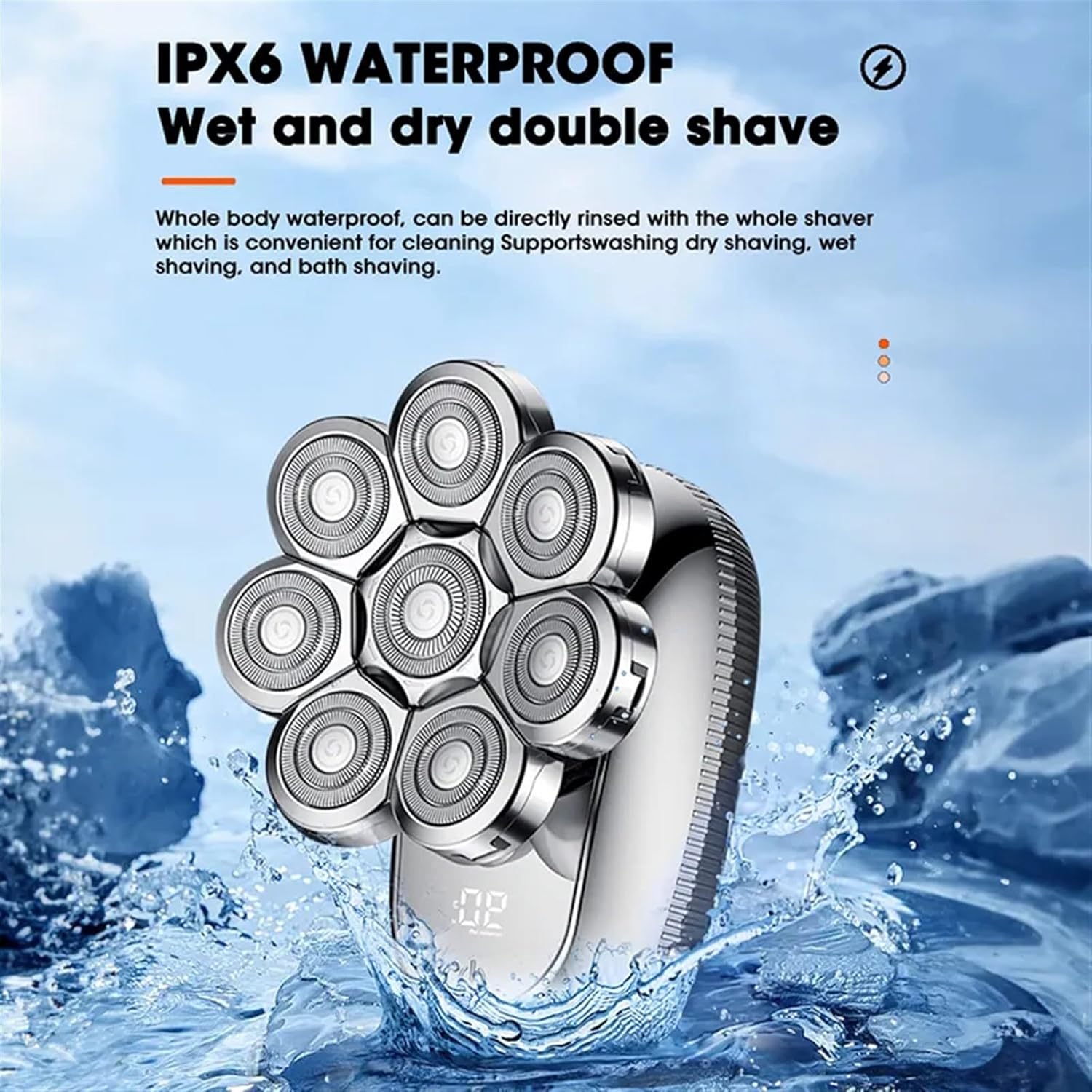 The RYDOX Electric Head Shavers for Bald Men is an 8-head rotary shaver designed for men who want a close and comfortable shave. It features a 6-in-1 men's electric head razor grooming kit, including a micro-shaver for precise detailing and a stainless steel body hair removal tool for men. The IPX6 waterproof design allows for wet or dry shaving, and the cordless operation provides 90 minutes of working time. The LED display shows the remaining battery life, and the shaver is easy to clean and maintain.