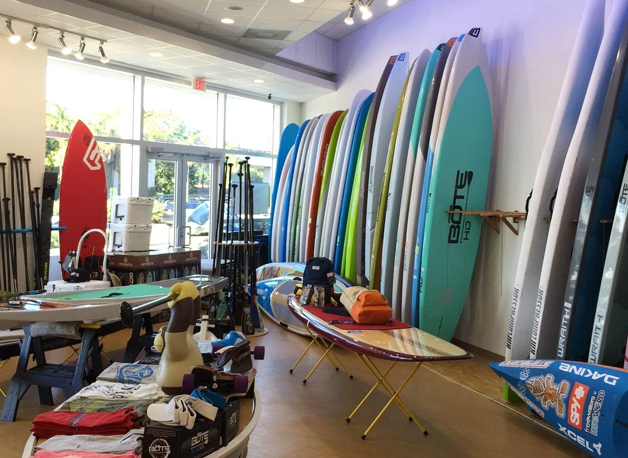 A Wall-Mounted Space Saver for Tall-Ceilinged Paddleboarders and Surfers and Shops. Our Wall-Mounted Vertical SUP & Surf Rack is our solution for homeowner and shops with tall ceilings and a robust quiver of paddleboards and surfboards. The vast majority of aquatic athletes find themselves constructing DIY racks for their quiver that lack in strength, safety, and aesthetics. Pro Tip: Let us do it. We've spent years perfecting our board racks so they look great and keep your boards on display in the safest, most organized way possible. You wouldn't put a Ferrari in a car port, so don't put your gorgeous, expensive boards on something as unstable and unsightly as 2x4s and PVC pipe. See Bamboo and Birch Color Swatch on 2nd Image for difference in appearance. Installed Dimensions 4 Boards: Height - 10" Width - 35" Depth - 24" Arm Length - 18.25" Arm Spacing (Board Clearance) - 5.75" Max Board Width - 36"