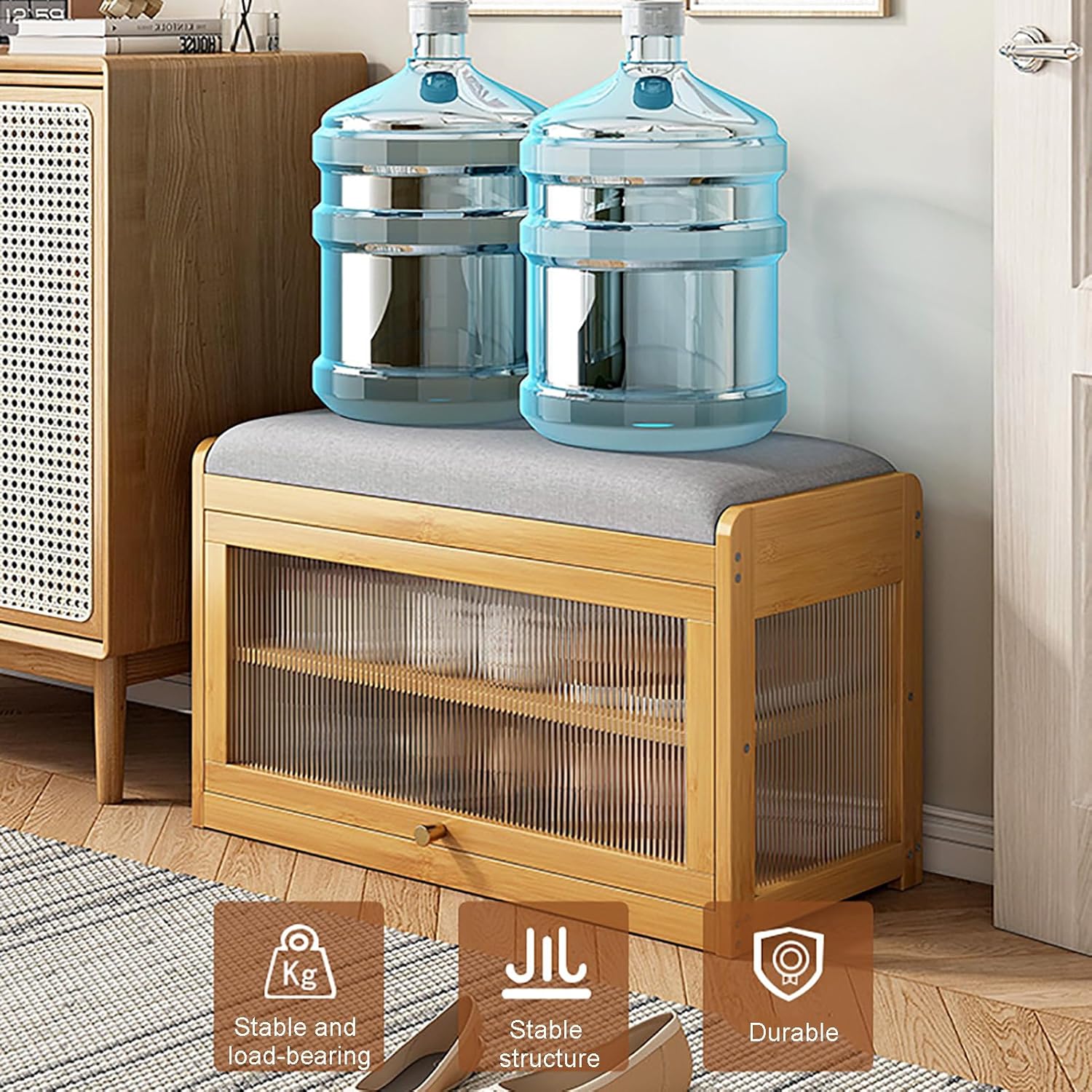 Enhance your home decor with our modern, luxurious 2-tier shoe rack with door, designed to bring style and functionality to any entryway or mudroom. Crafted with high-quality faux leather seating and a sturdy bamboo frame, this shoe bench not only complements your contemporary aesthetic but also offers a comfortable spot to sit while putting on or taking off your shoes. The cushion filled with high-density foam provides exceptional comfort for daily use, making it ideal for busy mornings or leisurely afternoons. With a maximum load capacity of 350 lbs, it is robust enough for the whole family. The thoughtfully designed two-tier shoe rack allows for easy nization of shoes, boots, and other accessories, keeping your space tidy and clutter-free. The sleek door adds an element of sophistication while discreetly hiding your footwear for a neat appearance. Whether you are welcoming guests or simply enjoying a quiet moment at home, this shoe rack bench elevates your living space with its modern flair. Perfect for a variety of settings, this versatile piece seamlessly fits into your hallway, living room, or even bedroom, making it an essential addition to your home. Upgrade your style with this elegant shoe bench that transforms your entryway into a chic and inviting environment. Order today and experience the perfect blend of luxury and practicality!