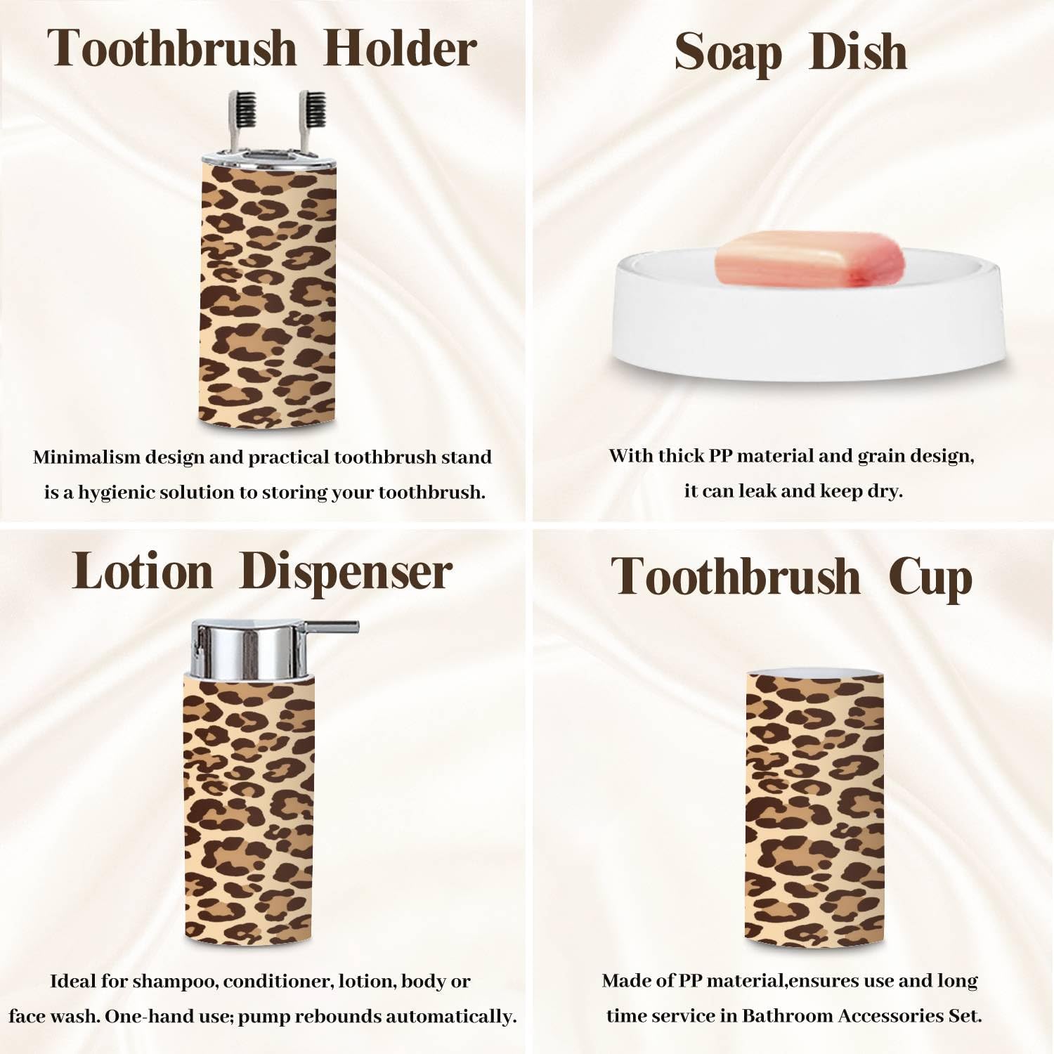 - Lotion DispenserIt can be pressed by one hand and rebound automatically. Use our soap dispenser for liquid hand soap, dish soap, lotion, shampoo, body wash, massage oils, etc.- Toothbrush Cup- Toothbrush HolderFits most sizes of toothbrushes, toothpaste, etc.- Trash CanWith swing lid, it's convenient for using.- Toilet Brush HolderHide the brush head inside the base- Soap DishIt can leak and keep dry.Please Note:1. Please allow tiny size difference for manual measurement.2. Please confirm the size before purchase.