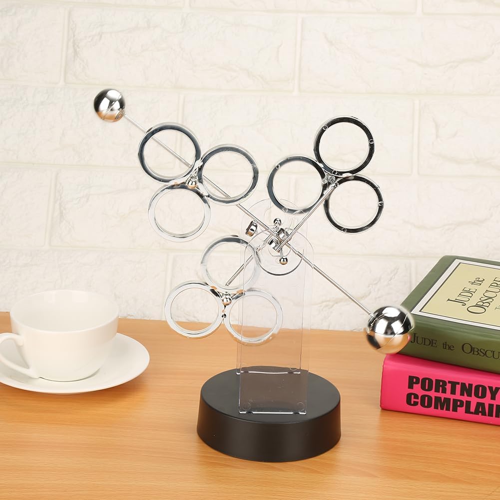 Specification: This isa piece of revolving art for your desk. It uses the battery power to keep itgoing. Once started, it keeps going. This classic desk toy is a great deskdecoration or present. Pick one up for yourself or for anyone in need of a littledesktop entertainment. Features: 1. Swing it by hands and it will use the battery power to keep on revolving. 2. It requires 4 AA batteries and will spin until the battery runs outor you stop it. 3. Add some fun for your desktop. 4. Creative design for children to have fun, it is also a piece ofrevolving art on your desk. 5. Beautiful decoration for your home, desk , office, table, a good present to your friends or family. Specifications: Material: Metal + Plastic Workmanship: Electroplating Power Supply: 4 x AA Battery (Not included) Color: Silver + Black Height: 32cm/12.6in Base Diameter: 11cm/4.3in Bracket Width: 21cm/8.2in Weight: Approx. 372g/13.1oz Package list: 1 * Perpetual Motion Model Note: 1. Due to the difference between monitors and light effect, thepictures may not reflect the actualcolor of the item. 2. Please allow slight error due to manual measurement. Thanks foryour understanding.