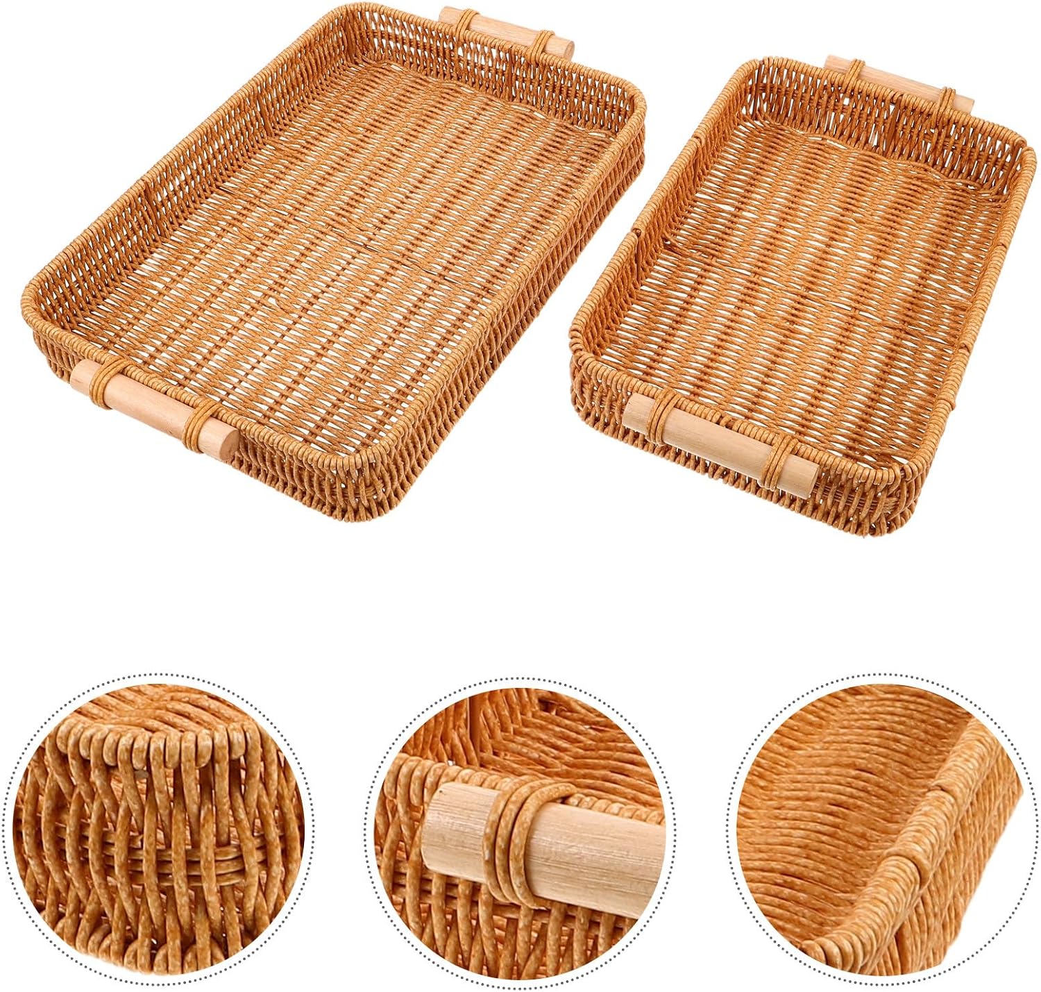 Package List 2 x Rattan Serving Tray Features -Artful utility: this hand woven bread basket offers both function and aesthetic appeal, serving as both a handwoven storage basket and a creative decorative centerpiece rattan fruit storage baskets -Multipurpose organizer: use this handwoven rattan basket for organizing snacks, utensils, or fruits, transforming cluttered spaces into orderly living areas effortlessly wicker storage basket -Material:PP,wood -Size:38.50X25.30X5.30cm/15.13X9.94X2.08in (Size L) -Freshness preservation: crafted as a handmade food storage piece, the rattan bread basket's breathable structure keeps bread and vegetables crisp and reduces humidity handmade food storage -Japanese minimalist design: the handmade rattan woven basket brings an elegant touch to any space, ideal for those seeking stylish yet practical bread serving baskets woven for home lightweight bread basket -Color:Khaki -Product Info: Storage basket -Dual handle convenience: with two sturdy handles, this woven storage basket with handle provides easy transportation, making it an excellent portable rattan basket for storage and serving woven rattan basket -Size:33.50X19.80X5.50cm/13.17X7.78X2.16in (Size S)Goods Informationhand woven rattan basket Presenting a imitation rattan storage basket with handle.vegetable storage basket Ideal as a hand-woven wicker tray, this elegant basket keeps bread, buns, and vegetables fresh and well-ventilated while its portable rattan basket with handle brings ease and a touch of charm to any gathering or daily use