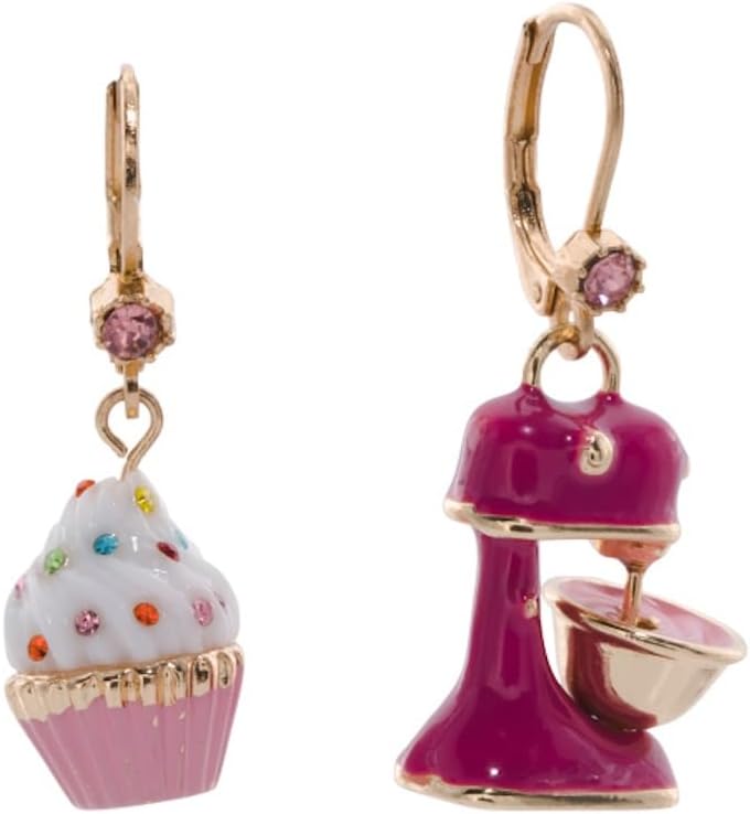 These whimsical Betsey Johnson mismatched drop earrings bring playful charm to any outfit with their delightful baking theme. One earring features an adorable pink cupcake with white frosting adorned with colorful sprinkles, while its pair showcases a vibrant fuchsia stand mixer complete with a mixing bowl. Each earring is accented with a sparkling pink crystal at the lever back closure, adding a touch of glamour to these fun designs. The detailed enamel work captures every charming element, from the cupcake's ridged wrapper to the mixer's miniature bowl. These conversation-starting earrings are perfect for baking enthusiasts, culinary professionals, or anyone who loves quirky, statement-making jewelry. The secure lever back closure ensures comfortable all-day wear while keeping these precious pieces safely in place. Whether you're heading to brunch, a casual gathering, or simply want to express your personality through your accessories, these mismatched earrings add a dose of sweetness and creativity to your jewelry collection.