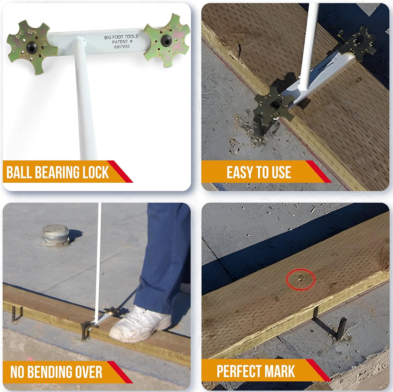 Elevate your layout precision with the Big Foot Stand-Up Bolt Hole Marker—an ingenious tool designed for pros. Ideal for 2x4 and 2x6 walls, it accurately marks 1/2", 5/8", 3/4", 1", and 1-1/4" bolt sizes, speeding up plating tasks while maintaining accuracy. Experience ease and accuracy standing up. Here's how: 1. Snap your chalk lines for the walls on the foundation 2. Place the sill plate/mud plate on the snapped line and align it with your chalk line. 3. Position the bolt hole marker indicator wheel against the bolt, resting on the plate - select the side you position against the bolt based on whether you're using 2x4 or 2x6 walls. 4. Give the top of the tool a solid hit with a hammer—This creates a precise, visible mark for drilling. The Big Foot Bolt Hole Marker ensures that your drilled holes align perfectly with your foundation bolts. By drilling holes just 1/16” larger, you achieve professional-looking results faster and easier than you ever could with a square. Say goodbye to oversized holes. The Stand-Up version introduces comfort to your framing routine, saving your back and knees. Manufactured with durability in mind, the Big Foot Tools Stand-Up Bolt Hole Marker features two locking indicator wheels that stay put, one side for 2x4 walls and one side for 2x6 walls. Made from tough steel and powder-coated to prevent rust, it's a tool that is made to work. Using just one tool, our patented design is unbeatable for the five most common bolt sizes. Never use your speed square or combination square again to lay out bolt locations; do it faster than ever.
