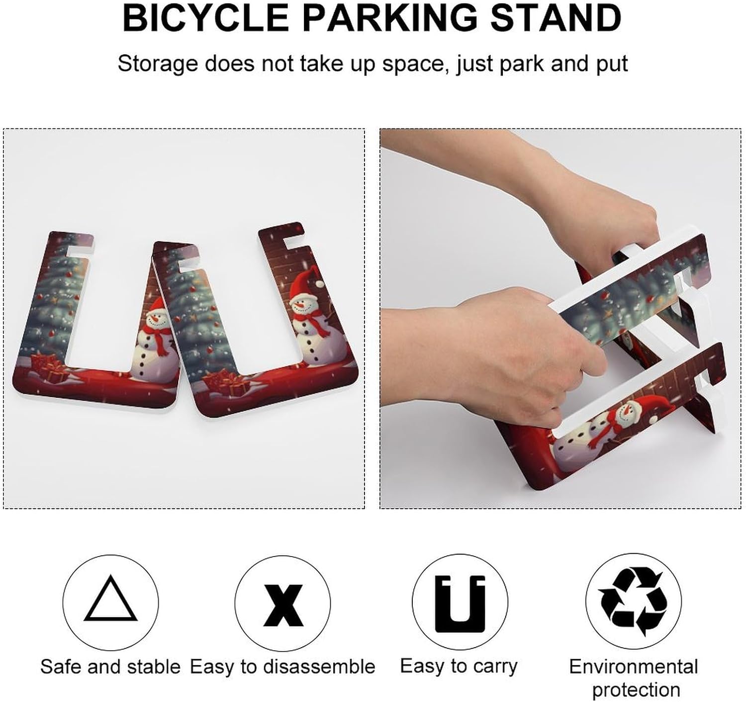 This Merry Christmas Day printed bicycle stand that does not require drilling can be easily folded up when not in use, and it is also easy to carry.It can be placed in your carry-on backpack without taking up spaceThe bicycle tire rack stand is convenient for you to use it to support your wheels when you are not riding a bicycle to protect your bicycle tires