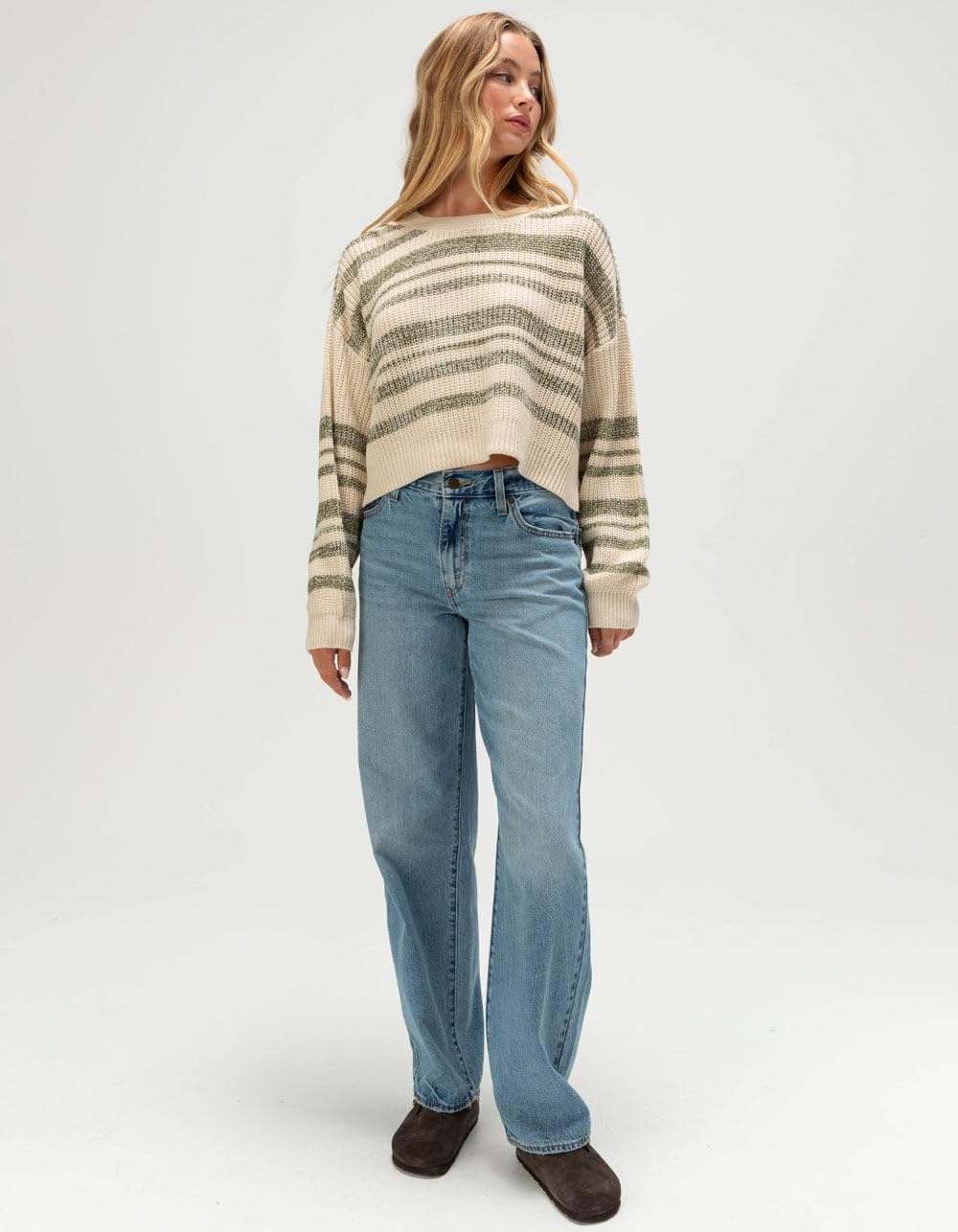 Billabong Hang Tight Sweater. The Billabong Hang Tight Sweater is a cozy pullover designed for effortless, laid-back style. Featuring an allover stripe pattern, this boxy-fit sweater delivers a relaxed silhouette that's easy to wear with anything from denim to cutoffs. Made from a soft cotton-acrylic blend, it offers lightweight warmth that's perfect for beach bonfires, coffee runs, or casual weekends. A subtle metal plate branding detail adds a touch of surf-inspired cool to complete the look. 57% Cotton, 43% Acrylic. Machine wash. Imported. | BILLABONG Hang Tight Womens Sweater