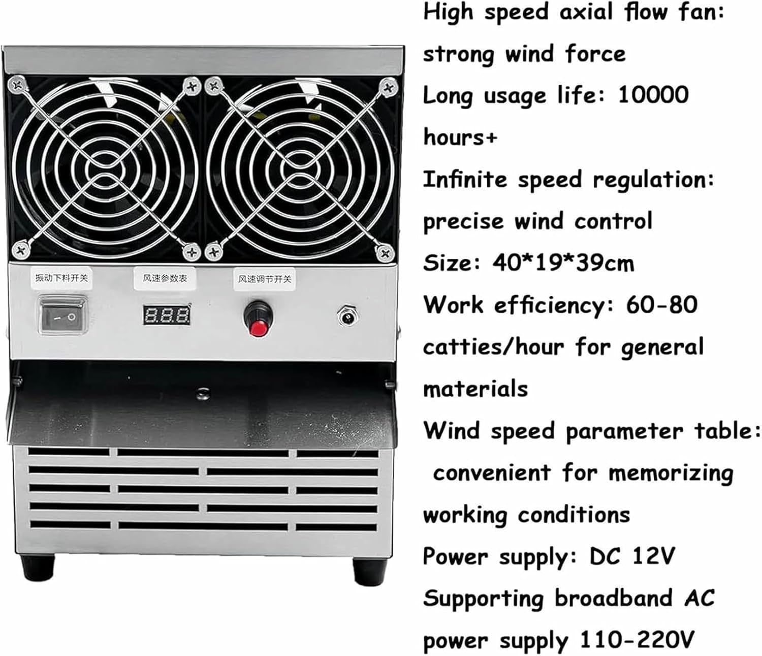 Adjustable feed port: According to different particle size and wind speed For small particles, use a small wind to adjust the feed opening to about 7mm For large particles, such as melon seeds and sesame seeds, use strong wind, And adjust the feed inlet to about 12mmSpecification: Name: Electric Blown Shell Separator Material: Stainless steel Voltage: 110-240V Efficiency: 30-40KG/H Work efficiency: 60-80 kg/hour Size: 40*19*39 cm/15.7* 7.5*13.4 inchesProducts include: 1*Bird Feed Blown Shell Splitter