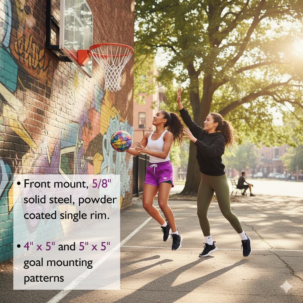 . Front mount, 5/8" solid steel, powder coated single rim . Low maintenance breakaway mechanism with padded cover-plate. . Six point lubrication system for smooth action (lubrication gun incl.). . Net hideaway attachment system . 4" x 5" and 5" x 5" goal mounting patterns . Includes net and mounting hardware. . Meets NCAA and NFHS specifications. . Indoor use only.
