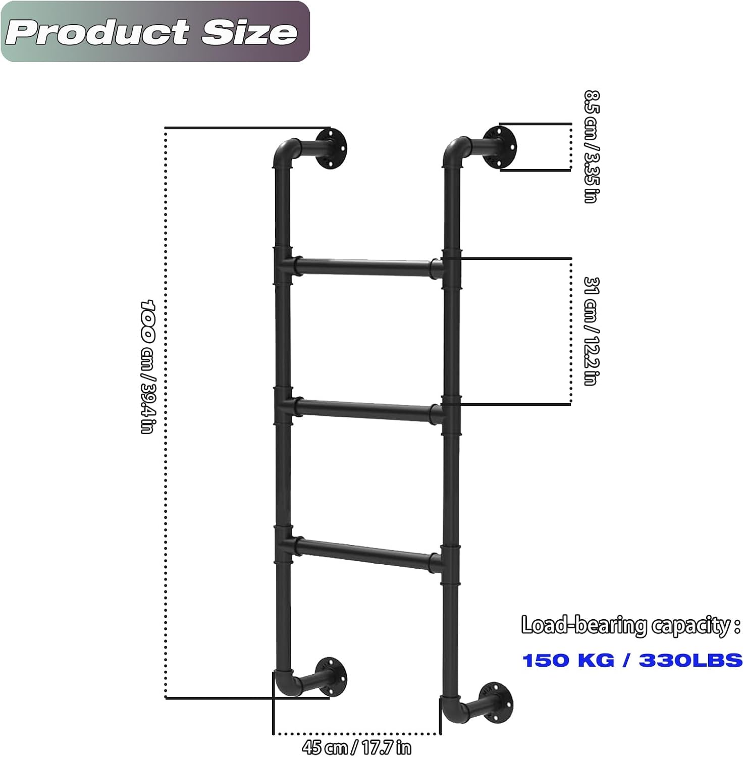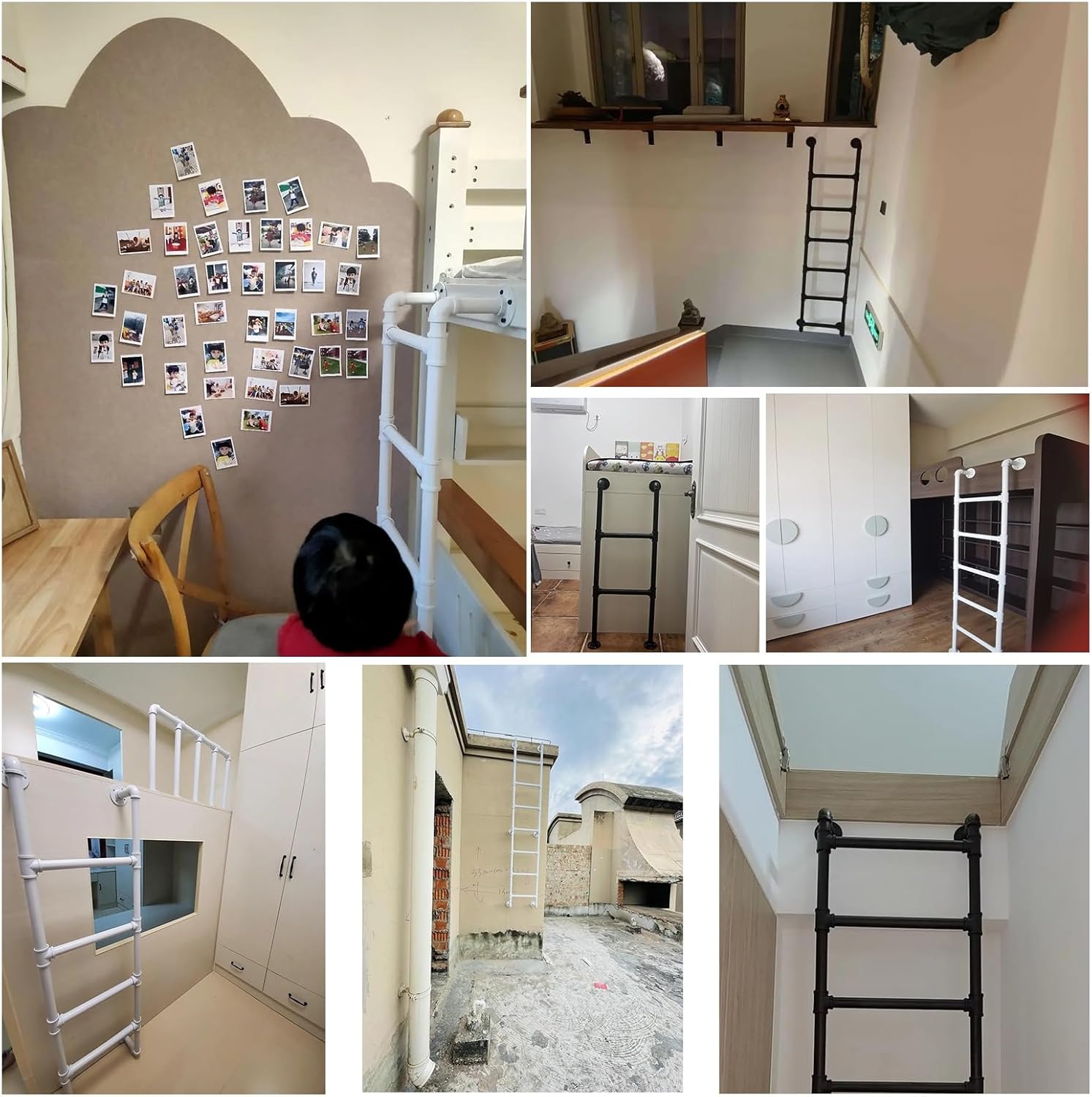 If you're looking for an expandable, widely-used and durable ladder, here it is! With this hook style loft bed ladder, no one needs to jump in or out of bed. Suitable for RV, school dorm room, children''s bedroom, etc.▶ Specifications.Product Name:Wall Mounted Metal Step Ladder for Home Loft, Height Entrance Egress Ladder, Basement Window Well Egress Ladder Fire Escape Ladder for Dorm, Library, Bunk Bed, Deck. Library, Bunk Bed, Deck, RV ,Loads 330lbsProduct Material: Galvanized Steel PipeProduct Size: Standard-100Cm,Package Weight: Standard-5KGProduct Color: Black,WhiteStep Width: 38cm/15"Ladder Spacing: 28cm/11"Wall Distance: 15cm(5.9")Base Dia: 8.5cm(3.3")▶ Features.- Made of metal galvanized steel pipe, stable and durable.- The sturdy ladder can hold up to 330 lbs.- Wide steps pad design for easy and safe access to the upper bunk.- The ladder can be quickly installed and used.- Easy to install and disassemble, easy to carry, and ready to use.- Portable and convenient for storing.- Be suited for Dormitory or bedroom loft bunk bed.- Be suited for Dormitory or bedroom loft bunk bed. Installed on the bunk bed's edge, easy to get on and off the bed.- It can also be used as a basement escape ladder. 1.1. Manual measurement, there will be 1-3cm error, please understand. 2. Due to light and personal differences, it can be used as a basement escape ladder.2. Due to light and personal differences in color understanding, there will be small color difference, in kind prevail.- Package Includes.1 x Ladder