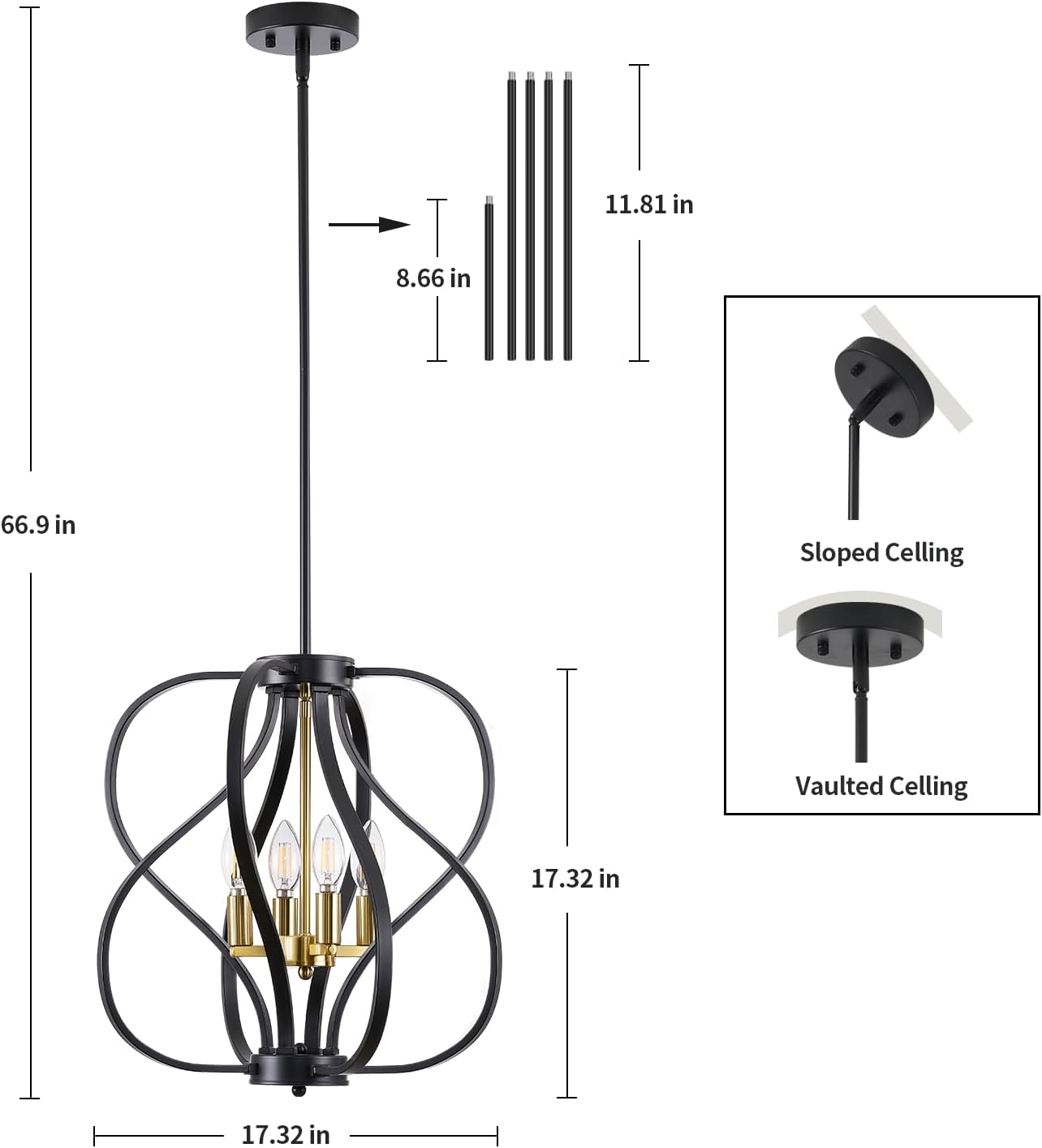 • Perfect Size and Height Adjustable - 4 Light black dining room light fixture measured 66.9 in Max Height, 17.32 in Diameter,black dining room light fixture equipped with 4*11.8 in rods, can be assembled according to their preferred height.