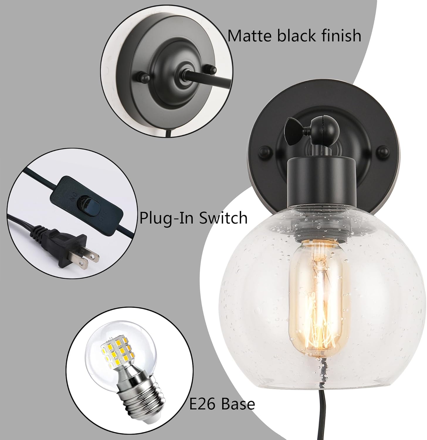 Set of 2 Plug-in LED Glass Wall Sconces with Dimmable FunctionYou can set the color temperature of the light by continuously toggling the switch, the color temperature can be adjusted to 3000K (warm light), 4500K (neutral light), 6000K (white light).The LED bedroom wall sconce arm can be adjusted up to 180°, you can rotate the knob on the elbow of the arm to adjust the lighting angle of the wall sconce, so as to meet your different lighting needs.Style: RetroColor: BlackType: Indoor Wall SconceShape: SphericalMaterial: Iron+GlassFunction: dimmable/180°adjustableSize:Cable size: 59inFixing disk: Ø4.72inLight source: E26Power: 4WVoltage: 110-130VLumen: 480lmProtection grade: IP20 With Battery: NoApplications: Plug-in wall sconces are recommended to be installed in dry places, perfect for dressing mirror, bedroom, nightstand, living room, study, bathroom, corridor, mirror, office and so on.Note: Please pay attention to the size before purchasing. Due to manual measurement, there may be 1-2 cm error. Due to different light and screen resolution, the color deviation is very small, plea