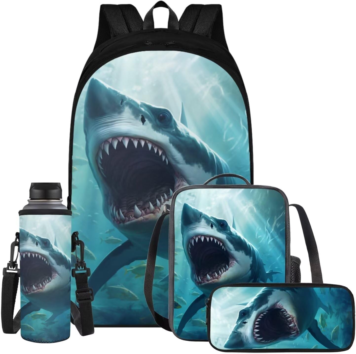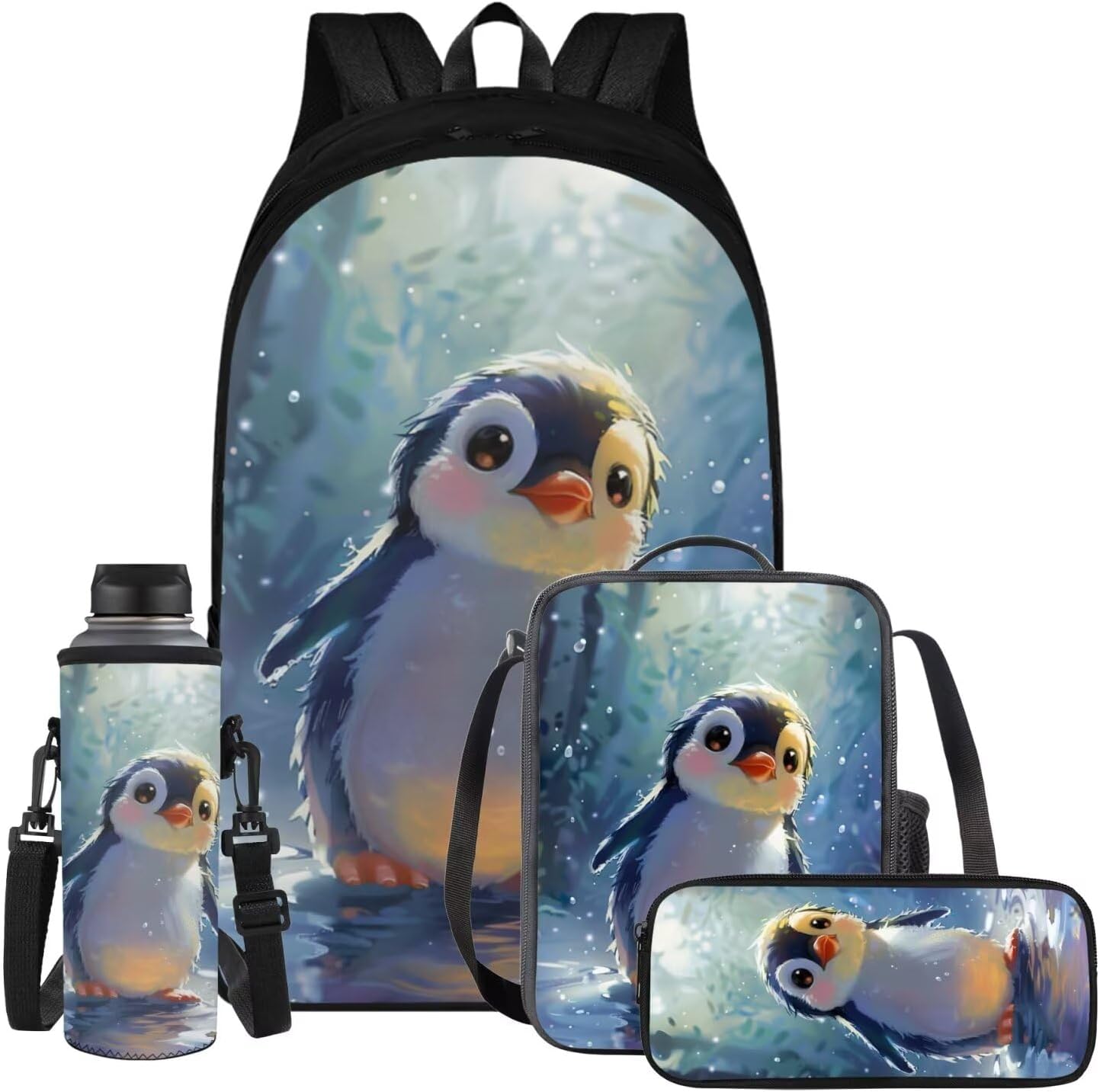 Multifunctional School Bag Set Children's Backpack - Size 11(Length) * 5.5 (Width) * 9(Height) Inches Our school duffel bag is made of polyester fabric, with fashionable lightweight casual design, simple, three-dimensional and stylish. With zip closure style, adjustable shoulder strap ergonomic design, can freely choose the right length, relieve the pressure on the shoulders, so that you feel relaxed and comfortable 0 burden. Portable Lunch Bag - Size 7(Length) * 2.7 (Width) * 9 (Height) Inches Our this lunch bag is made of polyester fabric with an anti-spill inner layer. The material is soft and comfortable, double zips with 1 mesh bottle pocket on one side, adjustable shoulder strap, internal elastic strap to secure small fork, knife and spoon handles, can be handheld or slung over one shoulder. Can be suitable for travelling, hiking, picnic, camping, school and so on. Cute Pen Pouch Case - Size 8.3(Length) * 1.5 (Width) * 3.9 (Height) Inches Made of polyester fabric, the material is comfortable and does not fade. Single compartment, half-circle zip closure style, only one zip pocket, simple and easy to store and spacious, easy to access. This versatile and stylish backpack can be used as a school backpack, school bag. Work backpack, travel backpack, laptop backpack, gym bag. Perfect for school, summer camp, travelling, work, interview, daily use, outdoor activities, mountaineering, hiking, camping, cycling, shopping, park. Can be used as a pen bag, mobile phone bag, make-up bag, coin purse and office stationery storage; suitable for office, at home, travelling and shopping. Water Bottle Holder - Size 3.8(L)* 3.8(W)* 10.2(H)inches Polyester fabric + shoulder strap + plastic hook. Comes with adjustable shoulder strap, carry it anywhere. Soft and wear-resistant, it can well protect the water cup from scratches on the surface. Can also be insulated to avoid being burned. Universal for most water bottle.