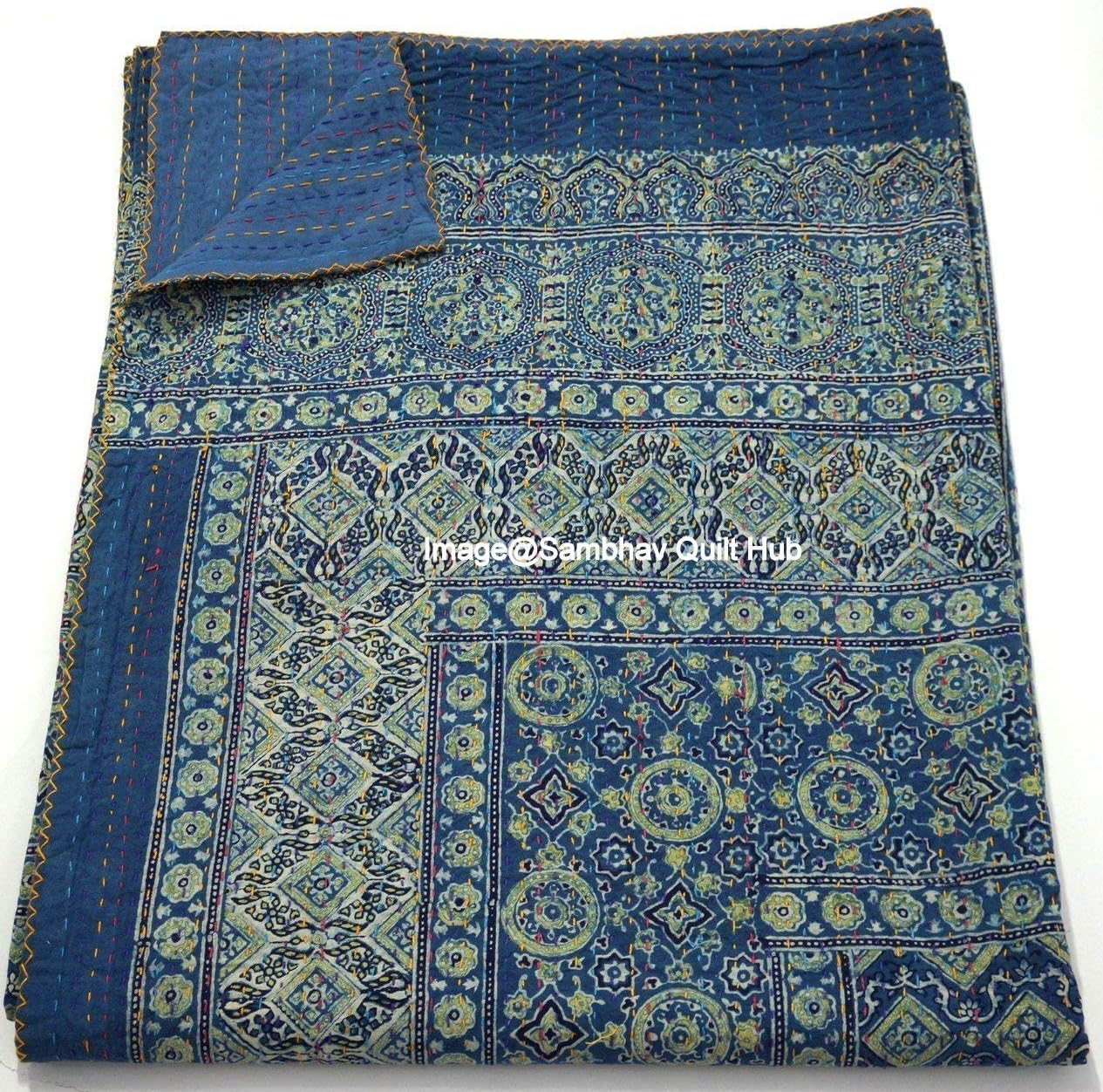 Made with 100% cotton and natural vegetable colors. This piece of art is completely hand stitched by Women artisan in Rajasthan, India. It can make any room alive with its vivid colors, stunning print and embroidery, made using traditional and famous kantha hand embroidery method. Made from two thin layer of cotton fabric make this piece of art irresistible and also very comfortable. Adding to its style, this kantha quilt is reversible and both sides can be used. Kantha is still the most popular form of embroidery practiced by rural women. Typically use old saris and cloth and layer them with kantha stitch to make a light blanket, throw or bedspread. This cotton lightweight "Quilts" with a beautiful and colorful Mukut design can be used as: 1. Bedspread, Bedding Throw, Blanket or Quilt 2. A Summer Bed Cover. 3. A Fabulous Picnic Rug 4. Nice Bedroom Quilt.