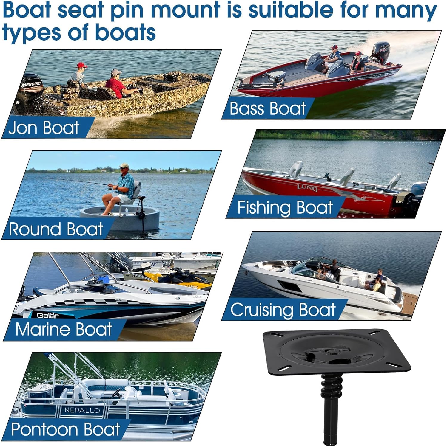 This durable boat seat pin mount from GZQIUYI provides a secure and comfortable seating solution for your watercraft. The Lock'N-Pin system features a patented design that leads the industry in safety, preventing unintentional detachment while exceeding ABYC Standard H31.6.1. Built with black e-coated steel construction, this mount includes a 2-3/4 inch steel pin with spring for a softer sit and enhanced comfort during long days on the water. The swivel base measures 7 x 7 inches with a 3-degree tilt and an installed height of 2 inches, designed to fit 3/4 inch marine pedestal posts. The high-strength alloy steel pin ensures reliable performance, while the spring mechanism absorbs shock for a more comfortable ride. This versatile seat mount is suitable for various boat types including jon boats, bass boats, fishing boats, pontoon boats, cruising boats, and marine vessels. The mounting plate features convenient installation holes for secure attachment. With decades of proven experience behind its design, this seat pin mount delivers outstanding economical performance and meets ABYC Code B Standards for marine applications.