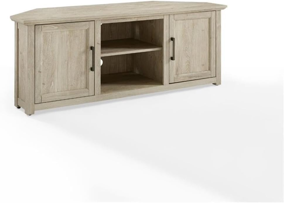 Ideal for smaller living spaces, the 58” Corner TV Stand tucks neatly into any corner. Featuring two cabinets with an adjustable shelf in each, this stand is ready to corral your books, video games, or other media. The open storage in the center offers an adjustable and removable shelf with two pre-cut holes in the back for cable management. Sized to fit most TV’s up to 60 inches, the 58” Low Profile TV Stand exudes rustic style with the look of wood-grain and substantial metal hardware.Features :- Material: MDF 55%, paper veneer 40%, pine wood 5%- Finish: Frosted oak, black- Frosted oak finish- Genuine metal hardware in an antique brass finish- Adjustable levelers on feet- One adjustable shelf inside each entertainment center cabinet- Open storage in the center section has an adjustable and removable shelf- TV stand for 65+ inch TV- Adjustable and removable shelf- Anti-tip hardware: No- Indoor furniture- Rustic design- Two pre-cut holes in back for cable management- Fits most TV's up to 60"- Pairs well with modern farmhouse and traditional decorSpecifications :- Product Dimensions : 22"H x 58"W x 20"D- Product Weight : 78.1 lbs- Shelf Weight Capacity : 15 lbs- Weight Capacity : (TV Stand) 100 lbs- Product Dimensions : (Floor Clearance) 1"