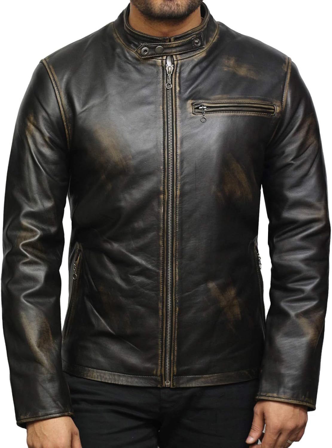 Invest in this timeless leather jacket, crafted from waxy real cow hide distressed leather that adds a vintage worn look. This garment features a classic press stud tab collar and is short in length and features a chest zipped pocket and 2 additional pockets at the waist for added practicality. To help provide a more customized fit the jacket includes a rear belt panel for added comfort. Lend a sleek touch to your wardrobe with this simple yet smart and durable leather jacket