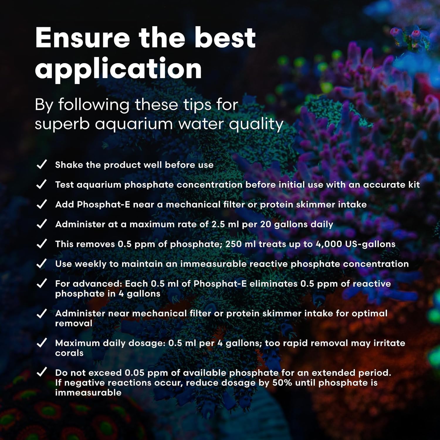 Phosphate, while required in miniscule amounts by living organisms for proper functioning, can indirectly negatively impact the overall appearance of an aquarium system if it is allowed to exist at a concentration measurable by most aquarium test kits (e.g. >0.05 ppm); in order for this impact to occur, other undesirable substances must be present in varying concentrations, however these substances are rarely limiting in the typical marine aquarium. Because of this, elevated phosphate concentrations, whether sporadic or chronic, should be combated. Phosphāt-E enables a quick solution to elevated phosphate concentrations by binding the reactive (“free”) form of the molecule and making it unavailable for biological uptake. The resultant inert phosphate compound (a particulate) may then be permanently removed from the system via mechanical filtration and/or protein skimming. This method of treatment may be used as needed and/or on a continual basis to maintain an immeasurable phosphate concentration in a marine aquarium. While Phosphāt-E provides a workable solution to potential phosphate-related problems, it should not be seen as an alternative to proper and sensible aquarium husbandry. Aquaria with extremely-low to immeasurable reactive phosphate often appear more pristine than those in which phosphate is allowed to persist in an elevated concentration. Feeding aquarium inhabitants sensibly, limiting the use of organic-based supplements and additives, use of a high-quality synthetic aquarium salt blend, and performing water changes/replacing evaporation with purified water are all important aspects of phosphate control. Additional means of limiting phosphate are maintaining a culture of macroalgae in the system to naturally deplete phosphate and other substances, and/or the use of an effective and well-maintained protein skimmer. Note: Phosphate test kits may show a false-positive reading after aquarium has been treated; this is a result of the chemical mechanism by which phosphate test kits operate and does not indicate that the product has failed to perform its intended function. The higher the percentage of bound phosphate removed by filtration, the more accurate test kit readings will be.