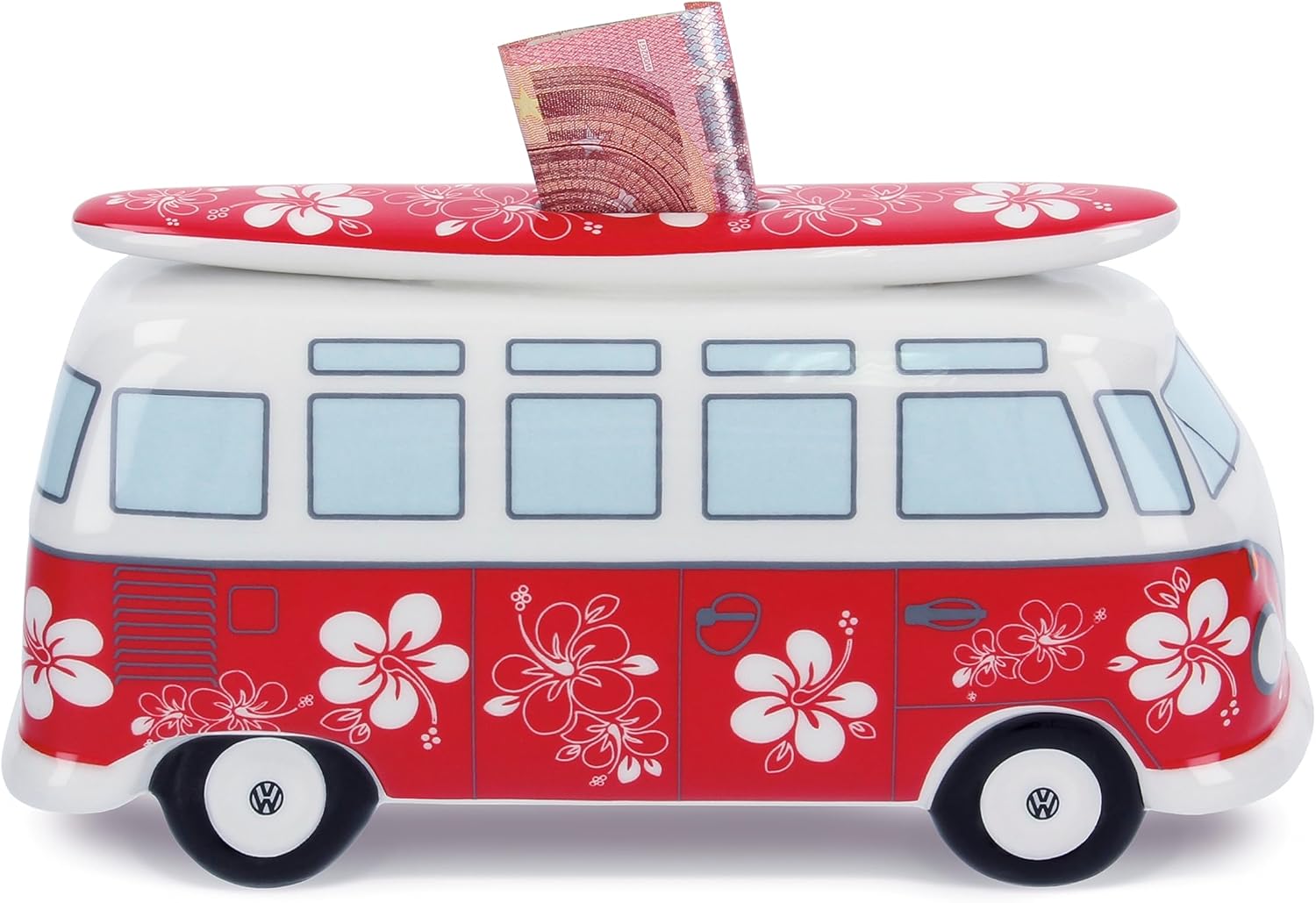 The extraordinary and colorful savings bank in the shape of the legendary VW T1 Samba will impress every saver! The Campervan piggy bank is perfect for collecting tips in the workshop. As a decorative element in a child's room or for saving up for your own camper, the bank is always ready. The cool appearance of the piggy bank makes this gadget a stylish vintage accessory. Opening and emptying the car is uncomplicated. A charming accessory that brings the flair of the 60s into your life. Carry your enthusiasm for VW out into the world. Design/Gift Idea/Miscellaneous: We offer this trendy fan item in the VW T1 "Campervan" bus/campervan design, painted in colorful and meticulously detailed colors. In stylish hippie design, with flowers and bubbles or in a rainbow peace look. Every VW bus as a piggy bank is something special! A surfboard in the car's color on the roof allows money to be inserted through a slot. A rubber plug on the underside of the VW Bus Samba serves as a closure, making it easy to remove the money. Since no hammer is needed to retrieve the savings, the piggy bank is endlessly usable! Includes a stylish white gift box that's perfect for immediate gifting. These money banks are excellent as a thank-you gift for friends or loved ones. What better represents Germany than this iconic cult style? Material/Technical Specifications: High quality standards and official licensing are a matter of course for us. They have been the foundation of our success since the introduction in 2013. The sweet money collector in the VW Bus Samba design, in a 1:18 scale, is made of high-quality ceramic. Crafted with great attention to detail. A fantastic accessory that stands out in miniature form! As the largest Volkswagen licensee, maintaining the highest quality standards is always our priority. Dimensions of these stylish classics: 25 x 12 x 10 cm.