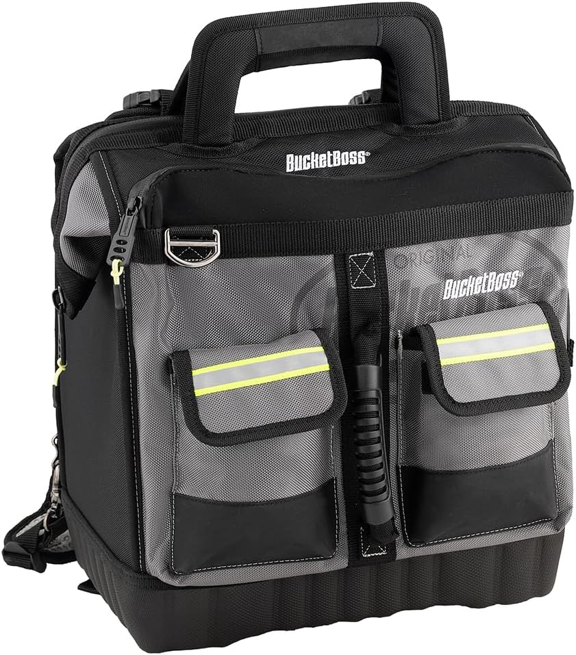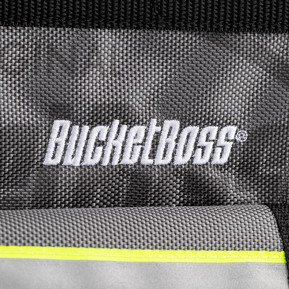 From the Bucket Boss Professional High-Visibility Series, the 14 in. High Visibility Professional Tool bag tool case has 23 total pockets and is built more like a case than a bag, hence the name. Equipped with 3M Scotchlite Reflective that meets ANSI and EN1150 Retro-Reflective worldwide standards for high-visibility and job site safety. Made for the professional, this tool bag is constructed with heavyweight 1680 2-ply poly fabric and boasts a molded, waterproof bottom to protect bag contents. This tool bag also features oversized StayPut handle grips that remain in an upright position, but also an innovative removable, adjustable strap system allowing the tool bag to be worn as a backpack, or tucked behind a cushioned back panel, or be removed altogether. D-Rings allow shoulder strap (not included) to be easily attached to the tool bag case. The front molded grip allows the tool bag to be repositioned easily while sitting upright, allowing the case to be used on a bench as a workstation. The zippered tech-pocket is lined with thick, flexible neoprene and holds up to a 13 inch laptop or tablet. Other features of this high visibility professional tool bag case include a waterproof zipper to keep its 28-liter capacity dry, and 23 total tool pockets - 19 interior pockets and 4 exterior pockets.