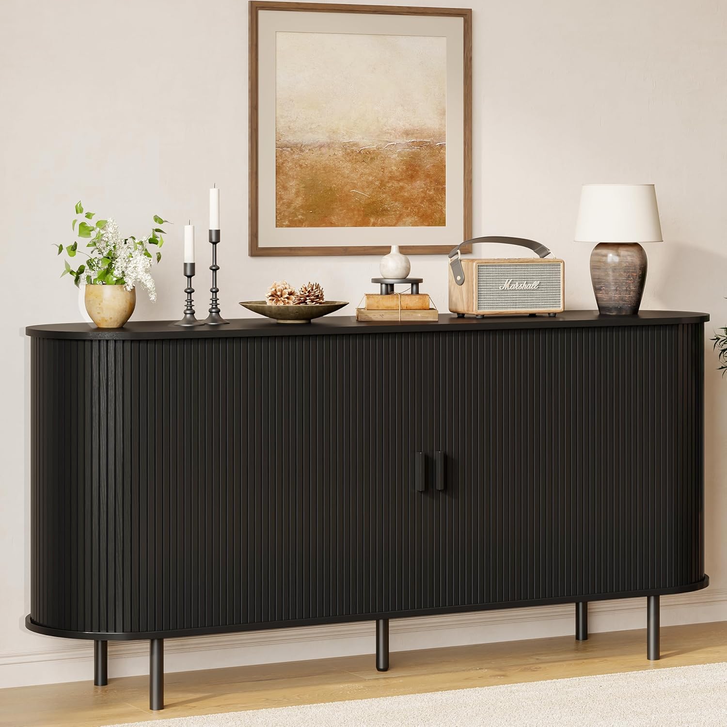 buffet sideboard cabinet with storage 55 inch fluted cabinet with sliding door & adjustable shelf, modern accent coffee bar console table for kitchen, entryway, black