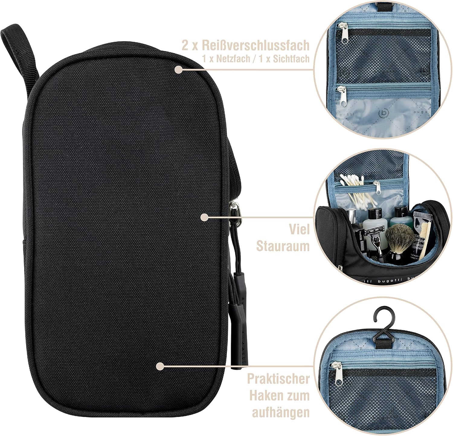 BLANC DELIGHT The perfect all-rounder for a wide range of uses is our new Blanc DeLight collection. Thanks to the perfect synergy of design, function and suitability for everyday use, this collection is an absolute highlight. The material combination of tarpaulin and high-quality nylon gives the collection a sporty daily look and is guaranteed to attract envious glances. With its exceptional lightness and stylish design, Blanc DeLight is a must-have for anyone who wants to be contemporary and fashion-conscious on the go. Features: 1 zipped main compartment. 1 zip pocket on the front. 2 side zip compartments. 1 small carry handle on the top. 3 mesh pockets. 1 zipped mesh pocket. 1 zipped viewing compartment. 1 hook for hanging. Product details: Dimensions: 24.5 x 12 x 22.5 cm (L x W x H). Weight: 230g Volume: approx. 5L Material: RPET600D nylon and tarpaulin light. Package includes: 1 x bugatti Blanc DeLight toiletry bag, black.