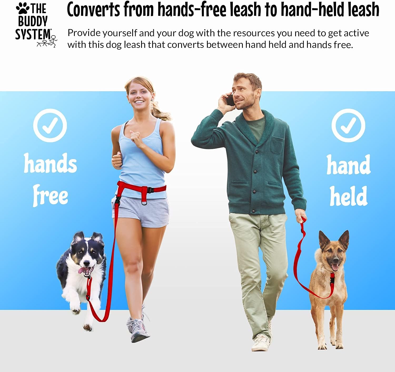 The Buddy System Hands Free Leash System is an innovative, hands free dog leash designed for walkers, runners, hikers, trainers ...anyone who wants both hands free, yet, desires to take along their best friend. The Buddy System Hands Free Leash System is set apart from other hands-free leash systems by its built in safety mechanisms and the ability to store the unused leash on the belt when the dog is off-leash. This Buddy Systems is available in 2 versions: the Regular Dog System (for dogs greater than 20 pounds) and the Small Dog System (for dogs less than 20 pounds). The basic leash system includes an adjustable belt, adjustable leash, 2 belt attachments, and collar attachment. The Regular Dog System is available in 3 adjustable belt sizes which can accommodate waist from 22" to 60". The Small Dog System is offered only in Black with 1 adjustable belt size accommodating waist from 27 to 50. Regular Dog System Sizing: Regular Size: 22-40" waist, Large Size: 27-50" waist, X-Large: 33-60" waist