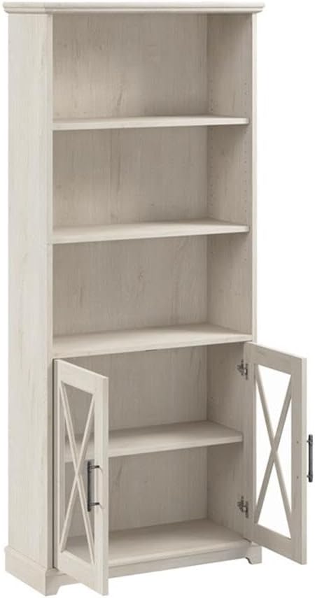 The Bush Furniture Lennox Farmhouse 5 Shelf Bookcase with Glass Doors boasts a practical design to help keep your home in order while conveying a natural, easy-going charm. Two shelves are fixed for stability while three can be adjusted to accommodate books and decorations of various sizes. Each shelf supports up to 50 pounds, so you can organize your personal library and show off larger decor items without worry. Tempered glass cabinet doors with X pattern accents cover the tall bookcase's two lower shelves to conceal the materials you don't want out in the open. The style, versatility, and stable design of this 5 tier bookshelf with doors makes it a great choice for a living room, home office, entryway, or any other residential space. The Lennox Collection's intentionally distressed finish and hardware reflect the best elements of coastal and farmhouse styling to fit perfectly in homes that embrace a more relaxed vibe. This Farmhouse Bookcase has been meticulously tested to meet or exceed industry standards for safety, durability, and performance and is backed by the Bush Furniture 1 Year Manufacturer's Warranty.