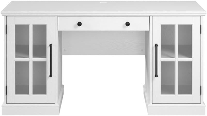 The Bush Furniture Westbrook 60W Computer Desk with Storage and Keyboard Tray is perfect for smaller home offices and for use throughout your home with its ample storage space and vast work surface. Complete projects and assignments with ease on a spacious desk surface that supports up to 200 pounds and includes a built-in wire management grommet to keep cords and cables out of the way. The home office desk features a storage cabinet with lovely windowpane glass doors on each side to organize your office essentials. The cabinet doors are adorned with long matte black handles and exposed barrel hinges that reflect the best elements of modern and farmhouse styling for an elevated look. The storage cabinets’ shelves can be raised or lowered to suit your needs. A pull-out drawer under the desktop provides a perfect place to keep your keyboard, laptop or small office supplies close at hand. Add a 60W Desk Hutch from the Westbrook Collection (sold separately) for additional storage and display capacity. This computer desk with storage has been meticulously tested to meet or exceed industry standards for safety, durability, and performance and is backed by the Bush Furniture 1 Year Manufacturer’s Warranty.