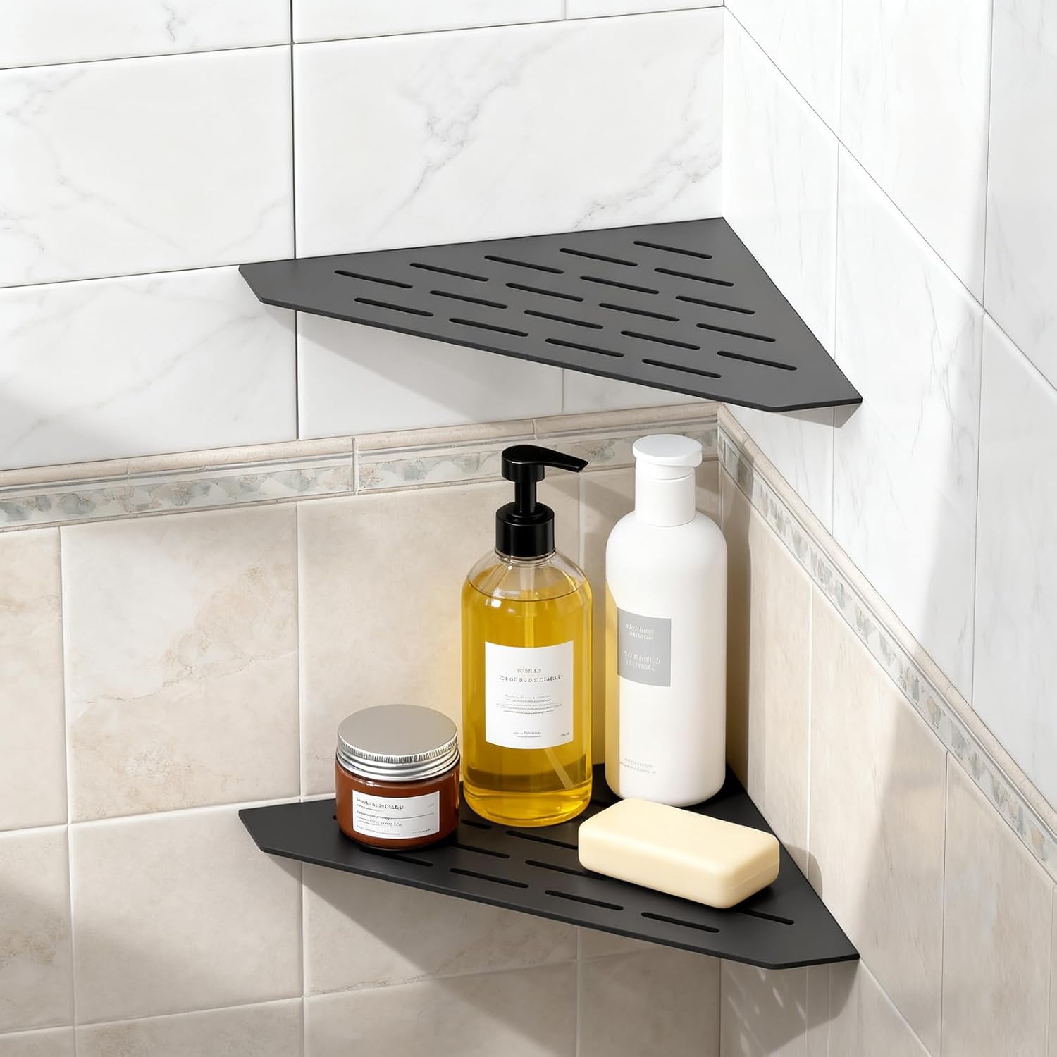 | Assembly Instructions Description | The Corner Shower Shelf installs by fitting into grout lines without drilling. Check compatibility: Ensure your tiles are thicker than 0.2" and grout lines are wider than 0.23" Cut grout: Use a multitool with diamond blade to remove grout where the 4 mounting tabs will fit Insert shelf: Place the shelf in the corner with tabs fitting into the grout slots Seal: Apply 100% silicone caulk around the tabs and let dry for 24 hours Tools needed: Multitool or Dremel with diamond blade for grout removal, 100% silicone sealant |