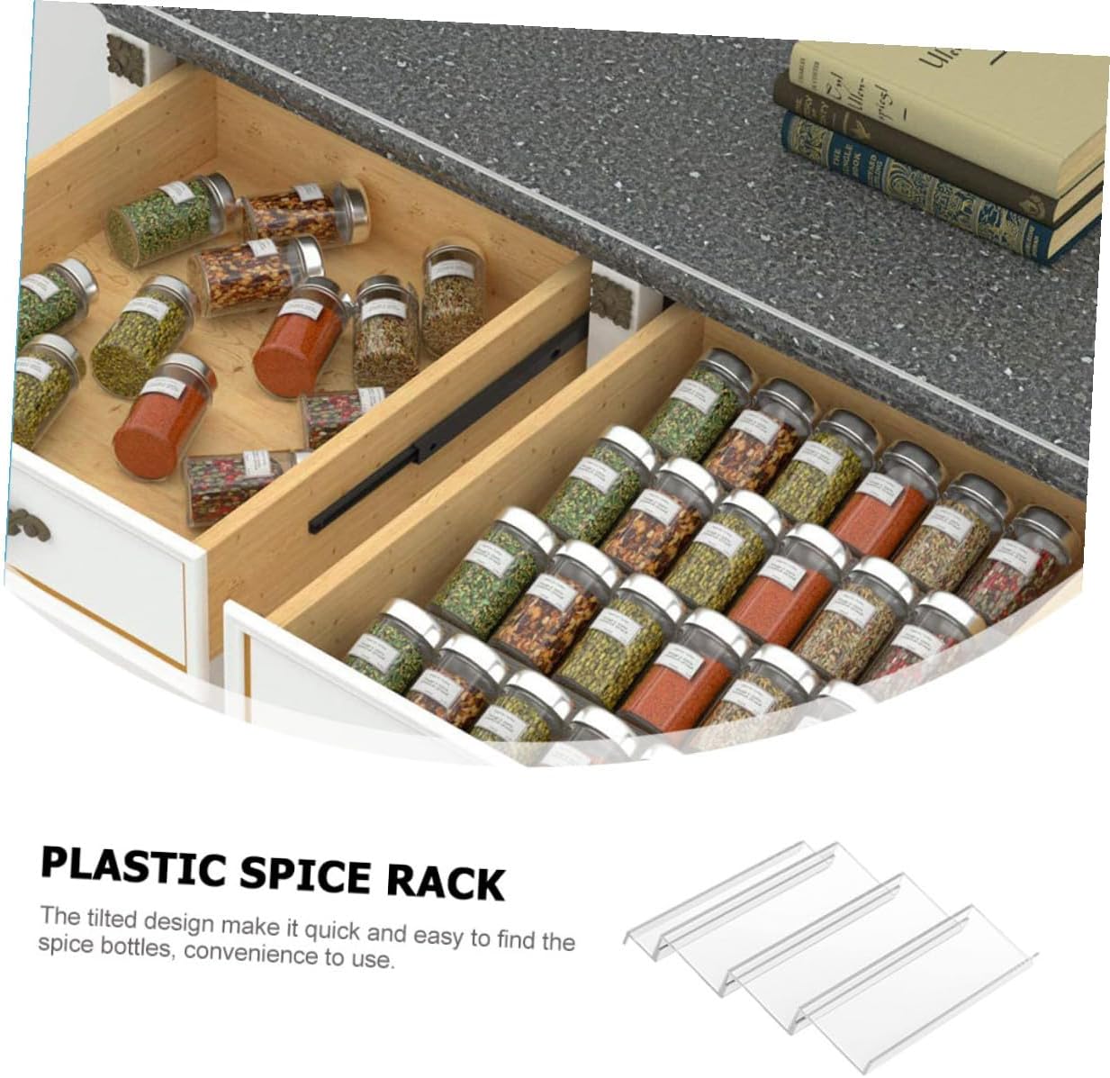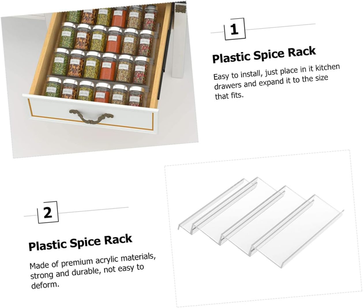 Package Include 1 x Spice Bottle Rack Set Characteristics -Product Info:Seasoning storage rack - Color: Transparent. - Size: 45.00X34.00X4.30 cm/ 17.68X13.36X1.69 inch. - Material: Acrylic. - Made of acrylic materials, multi-tiers design, you can expands the size that you need. - It is perfect for storage seasoning, spices, curries, salts, baking supplies and more spice storage organiser. - Create more space in kitchen cabinets with this functional tiered shelf organizer spice rack cabinet. - It help to keep your kitchen looking organized and clean, easy to install spice organizer for cabinet. - You can place it in kitchen drawers, cabinets, shelves, cupboards or on countertop cabinet spice organizer.Goods Descriptionspace saving spice rack organizer This spice storage rack is made of premium acrylic material, transparent design, and sturdy.Spice Bottle is a beautiful tool in the kitchen, enough space for spices and seasoning bottles.spice drawer organization You can place it in your kitchen cabinet, will not take up countertop space, convenient for storing seasoning jars