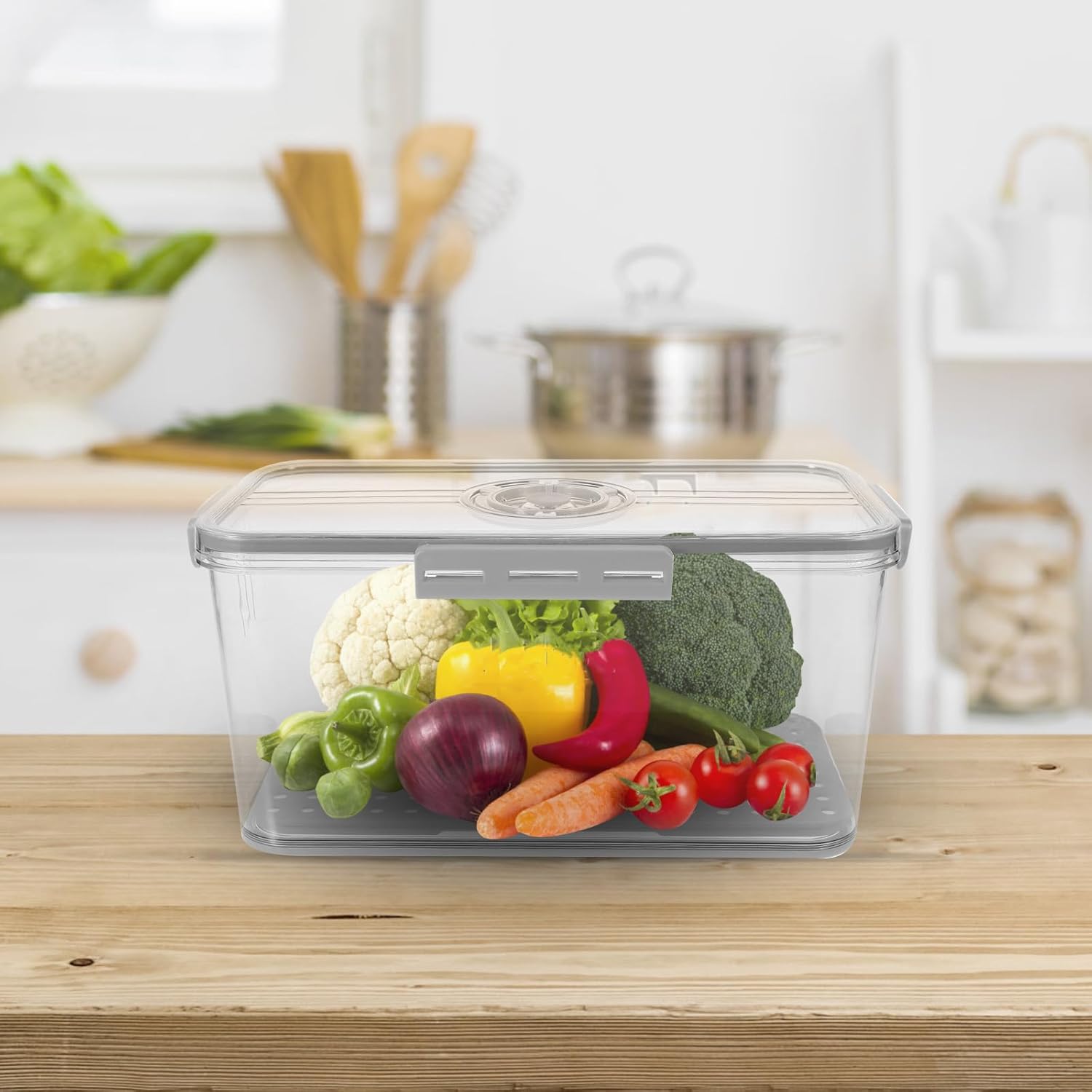 Package Include 1 x storage box Features - Airtight feature: with 4-sided lock and a detachable sealed ring, it can provide excellent seal protection for food and fruit bread storage container. -Clear Storage Box: The body of the fridge storage box is clean, it is convenient to see the food inside of box, instead of opening the lid. plastic bread container -Wide Application: The refrigerator container can be used to store fruits, vegetables and other food, multipurpose bread storage for homemade bread. -Product Info:Fresh box -With a drain tray: Featuring a removable drain tray, it can be used to help you to drain the water from the fruits and vegetables large capacity bread storage container. -Size:32.50X17.50X15.50cm/12.77X6.88X6.09in -Color:Grey -Timer Lid: Designed with timer dial on the top of the sealed lid, make it easy to record the date and easy to help you identify the freshness of the food. toast organizer -Material:PET, PP, siliconeGoods Informationkitchen storage case Manufactured with reusable material, this food container is wear resistance and sturdy enough.bread holder Large capacity, can be used to store fruit, vegetables, food, etc.Container For Fridge You can also use it as draining tray.large capacity bread storage container Thoughtful designed in appearance and make it easy for you to take out and put in