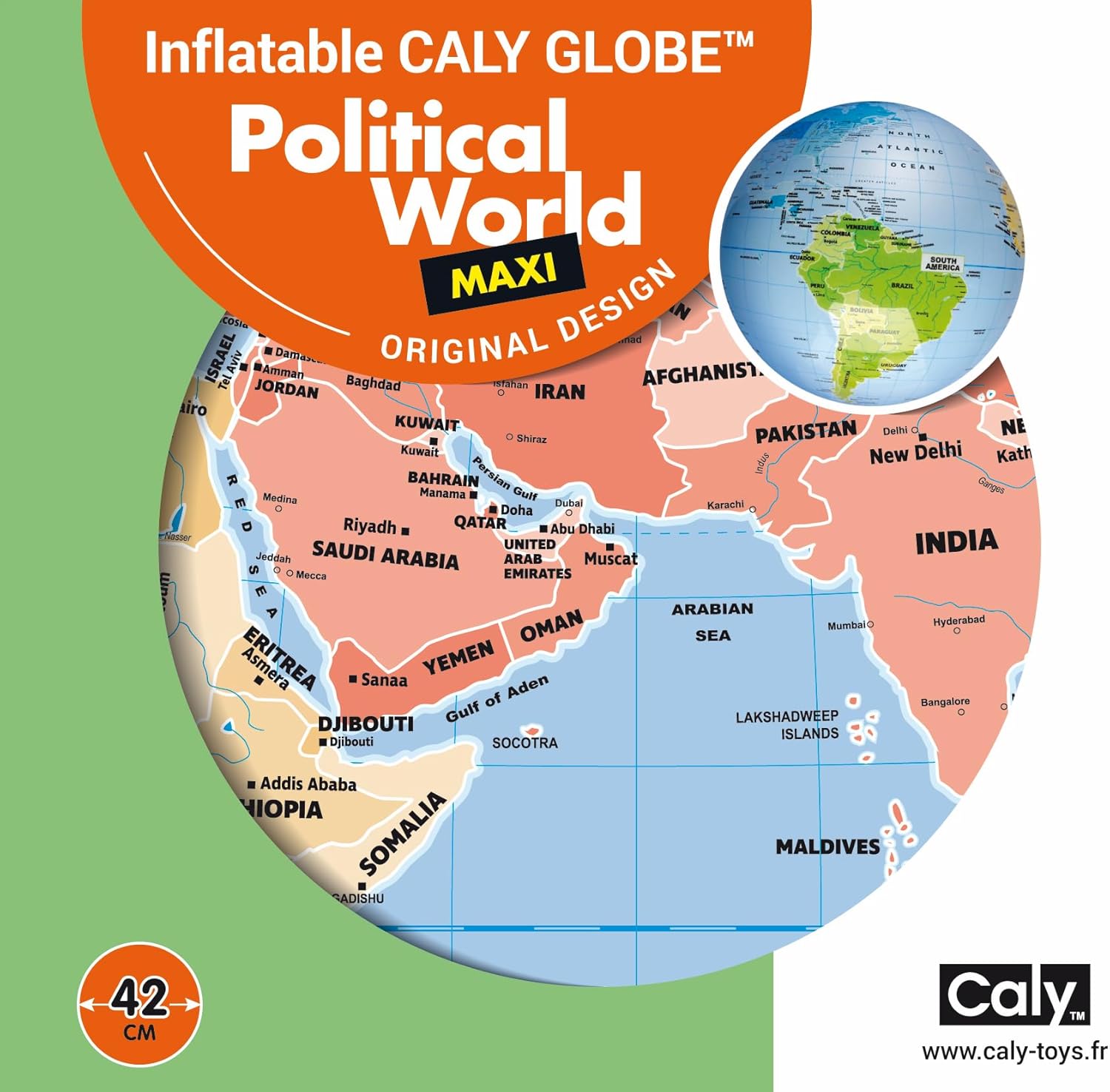 An inflatable globe of 42 cm diameter with a political world map, unique with its beautiful colors and sturdy enough for children to play with. The names of capitals and larger cities are indicated, as well as many islands.