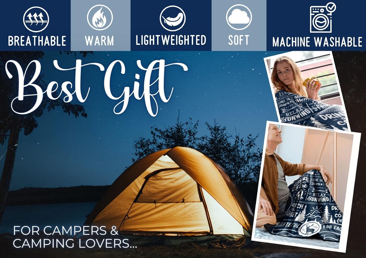 Camping Gifts for Women Men Lovers Throw Blanket, Happy Campers Decor Outdoor, RV Campsite Travel Hiking 60" x 80" - Happy Campers