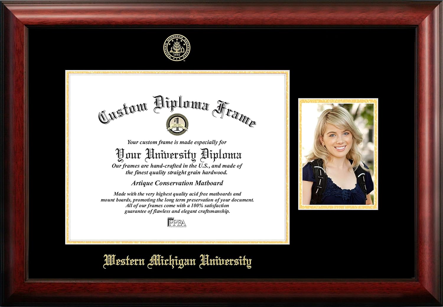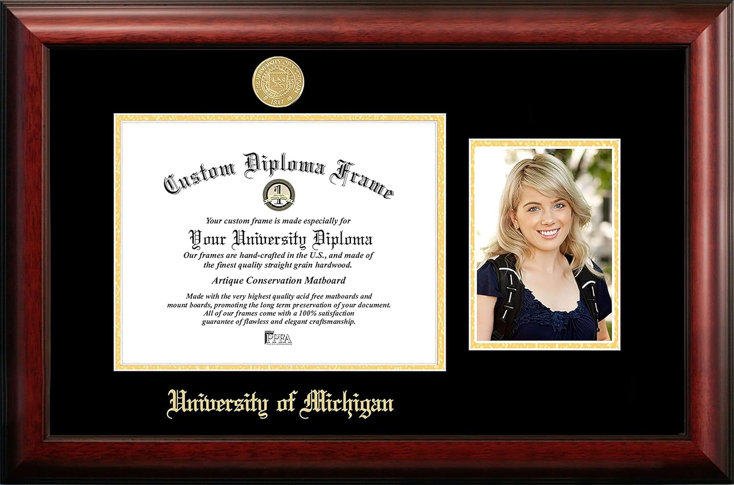 Classic Satin Mahogany diploma frame, gold embossed with Portrait. 14k Gold Plated Medallion or Foil seal with the official university marks and imprinted with University Name. Everything you need to insert your document and hang the frame is included.